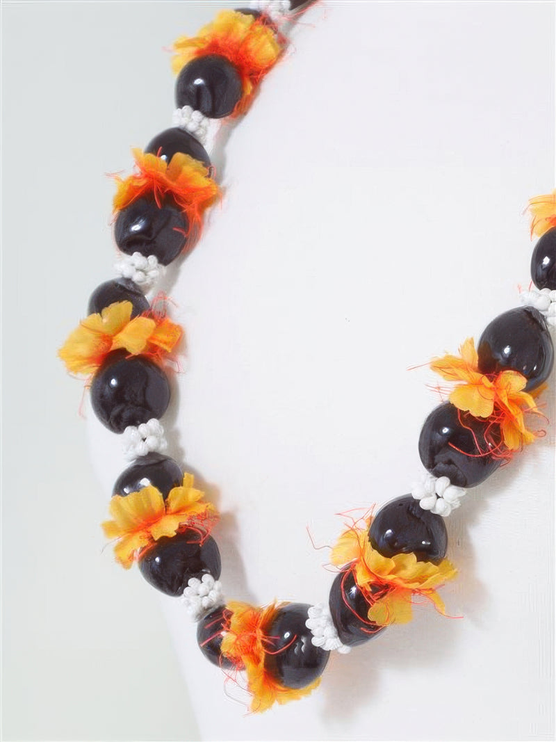 Ka Makani - Black & White Kukui Nut, Ilima & Mongo Shell Lei
