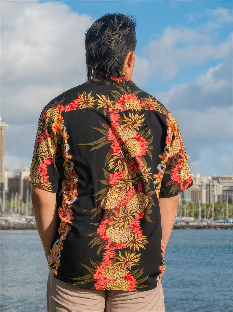 Hilo Hattie - Pineapple Panel Black Rayon Men's Hawaiian Shirt
