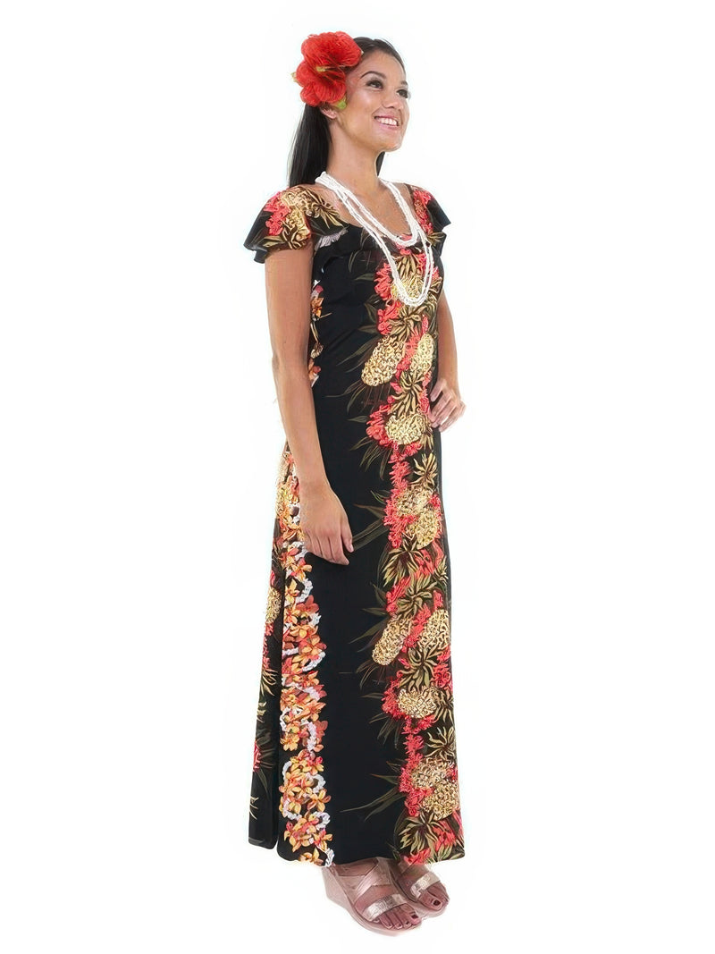 Hilo Hattie - Prince Kuhio Black & Green Rayon Piping Neck Long Dress