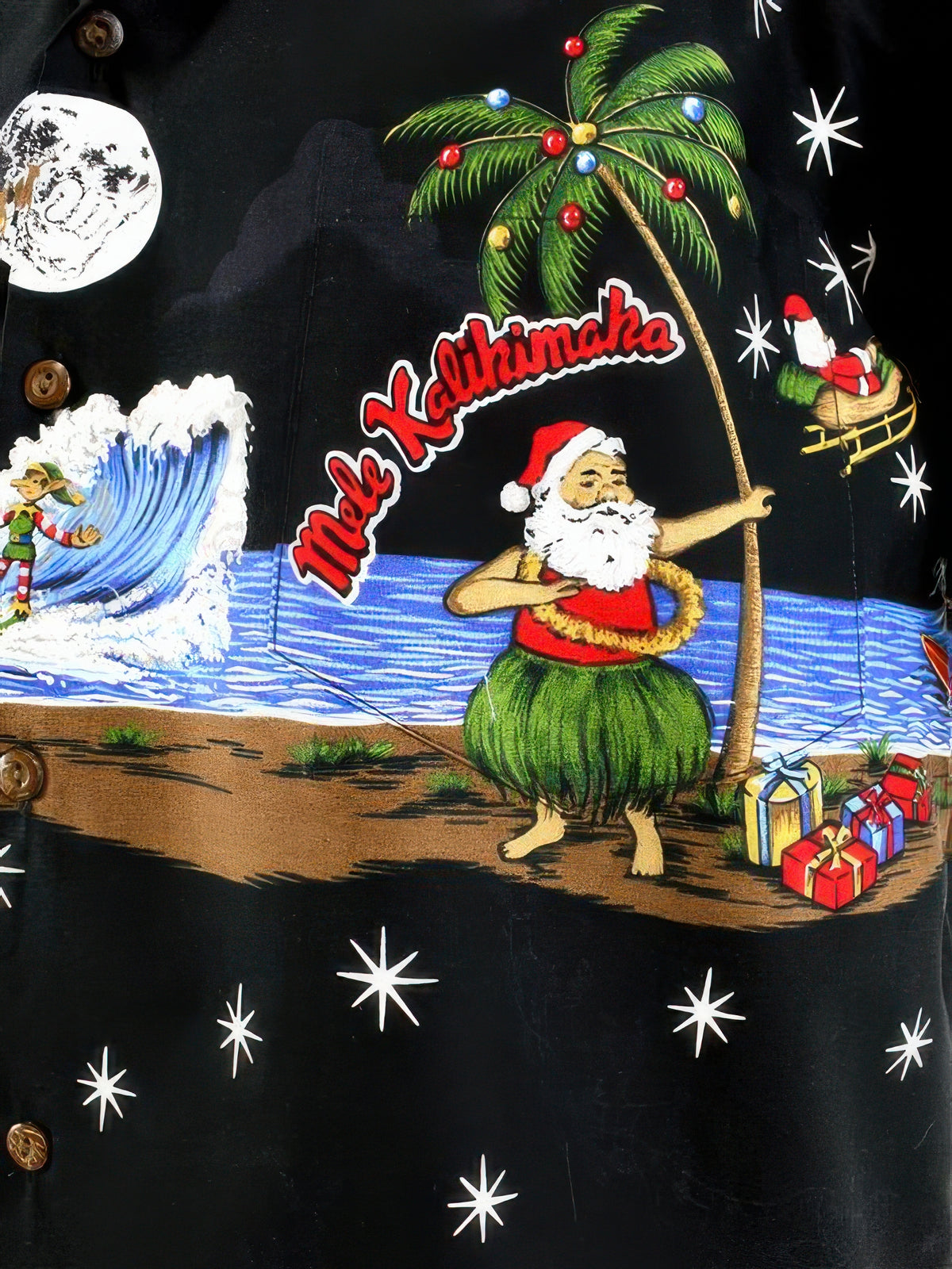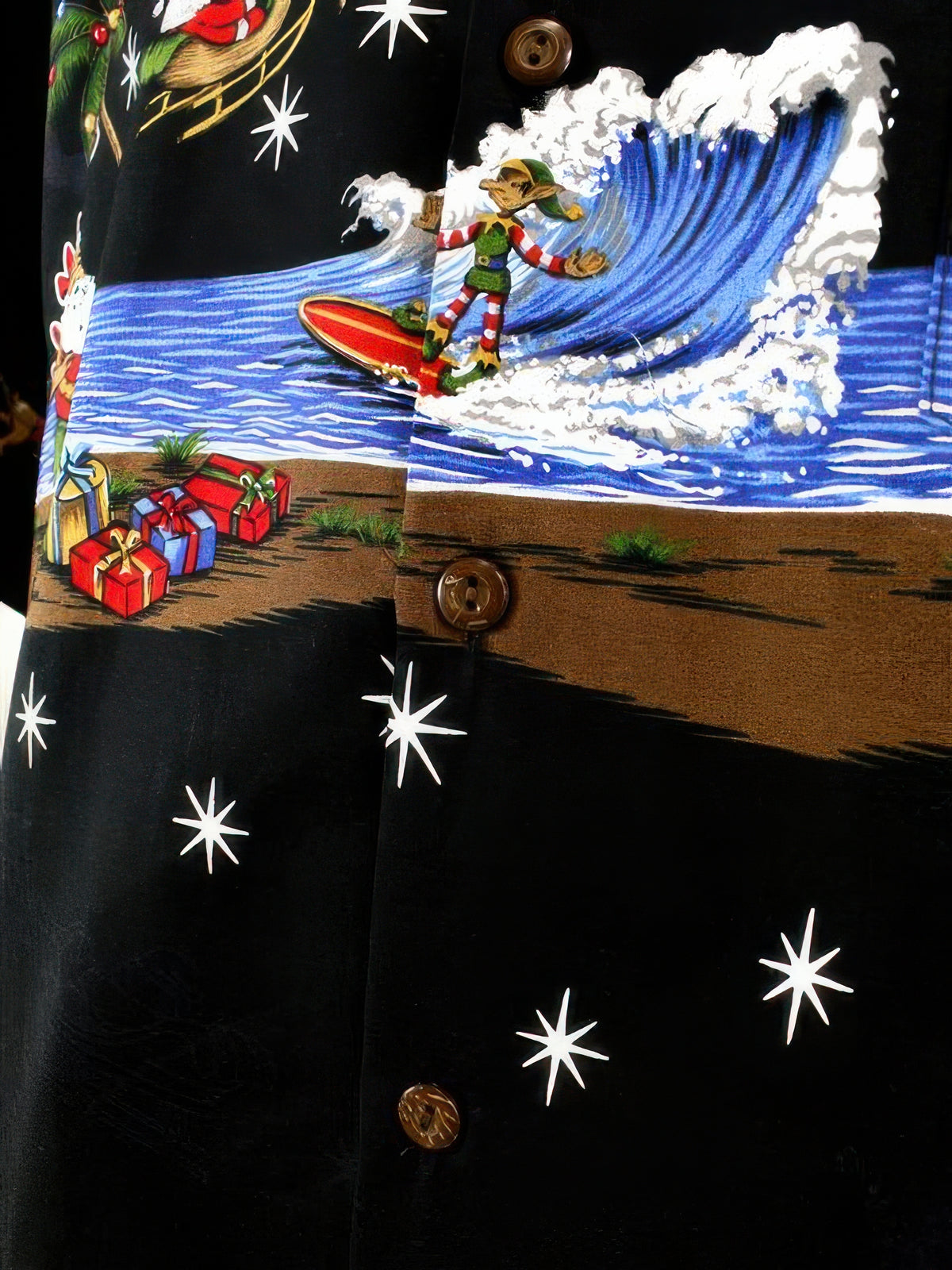 Our Active Santa Black Cotton Men's Hawaiian Shirt captures the ultimate tropical twist on Christmas cheer, featuring Santa catching waves, soaring through sunny skies, and spreading joy from above.
