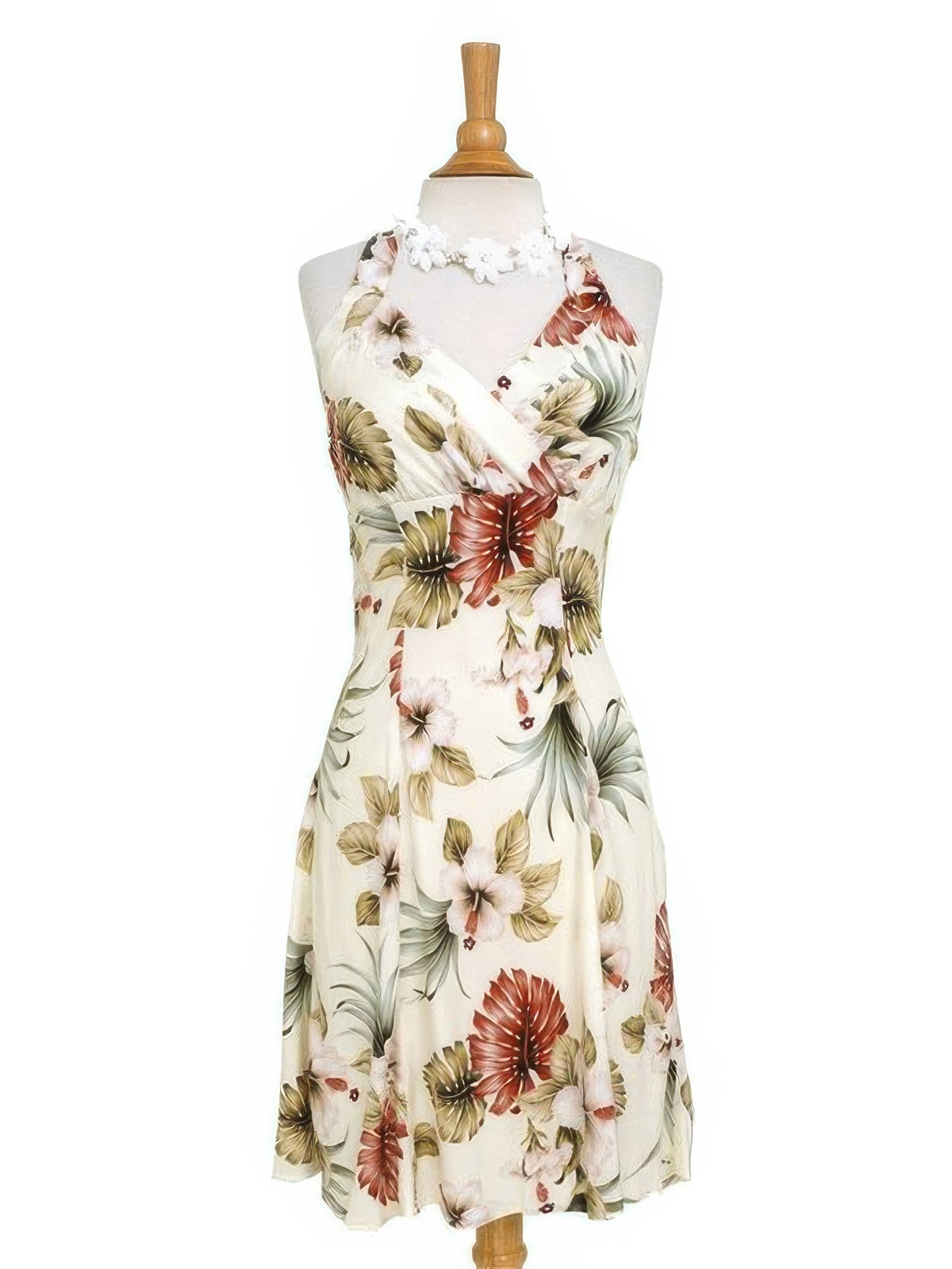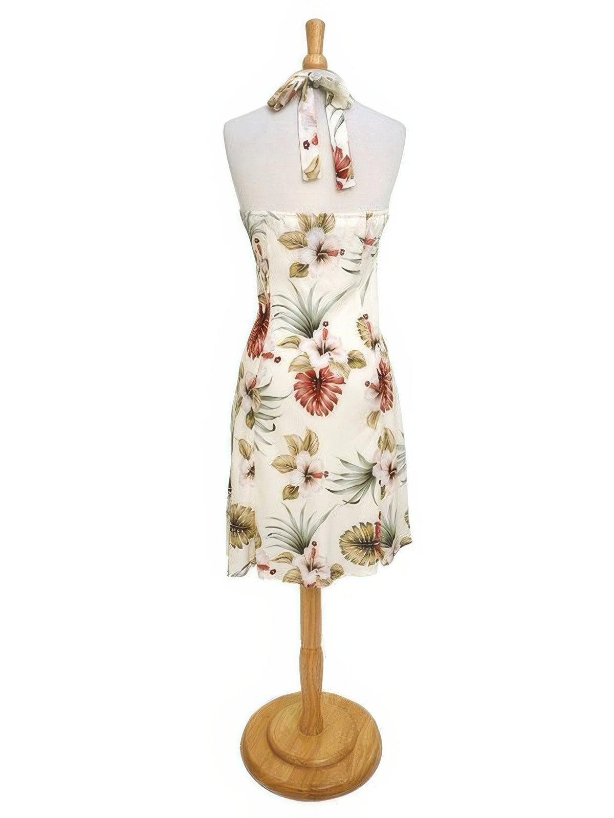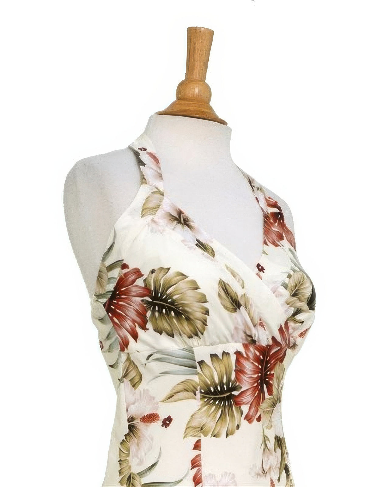 Royal Hawaiian Creations - Hibiscus & Monstera Cream Rayon Hawaiian Halter Neck Midi Dress