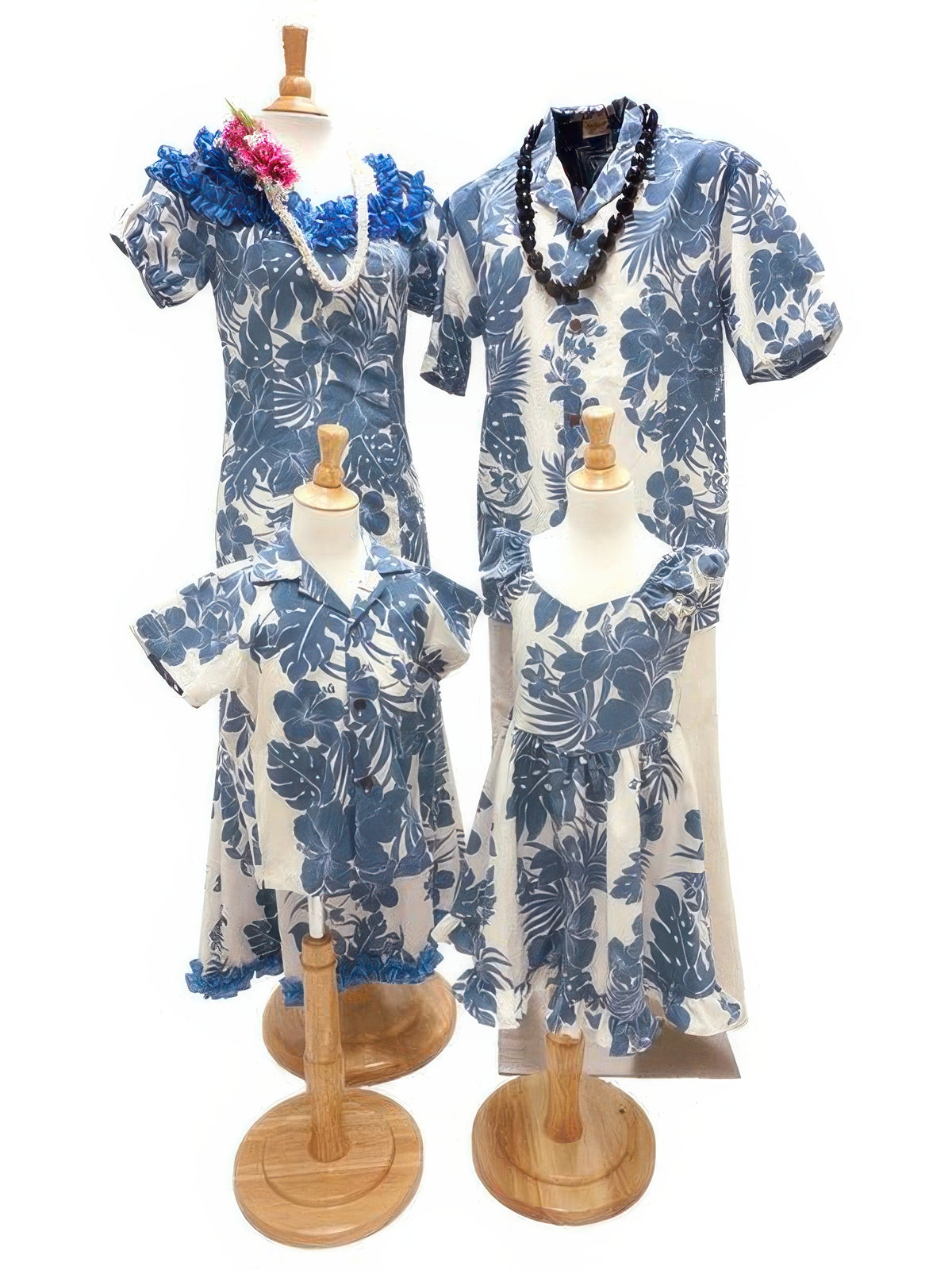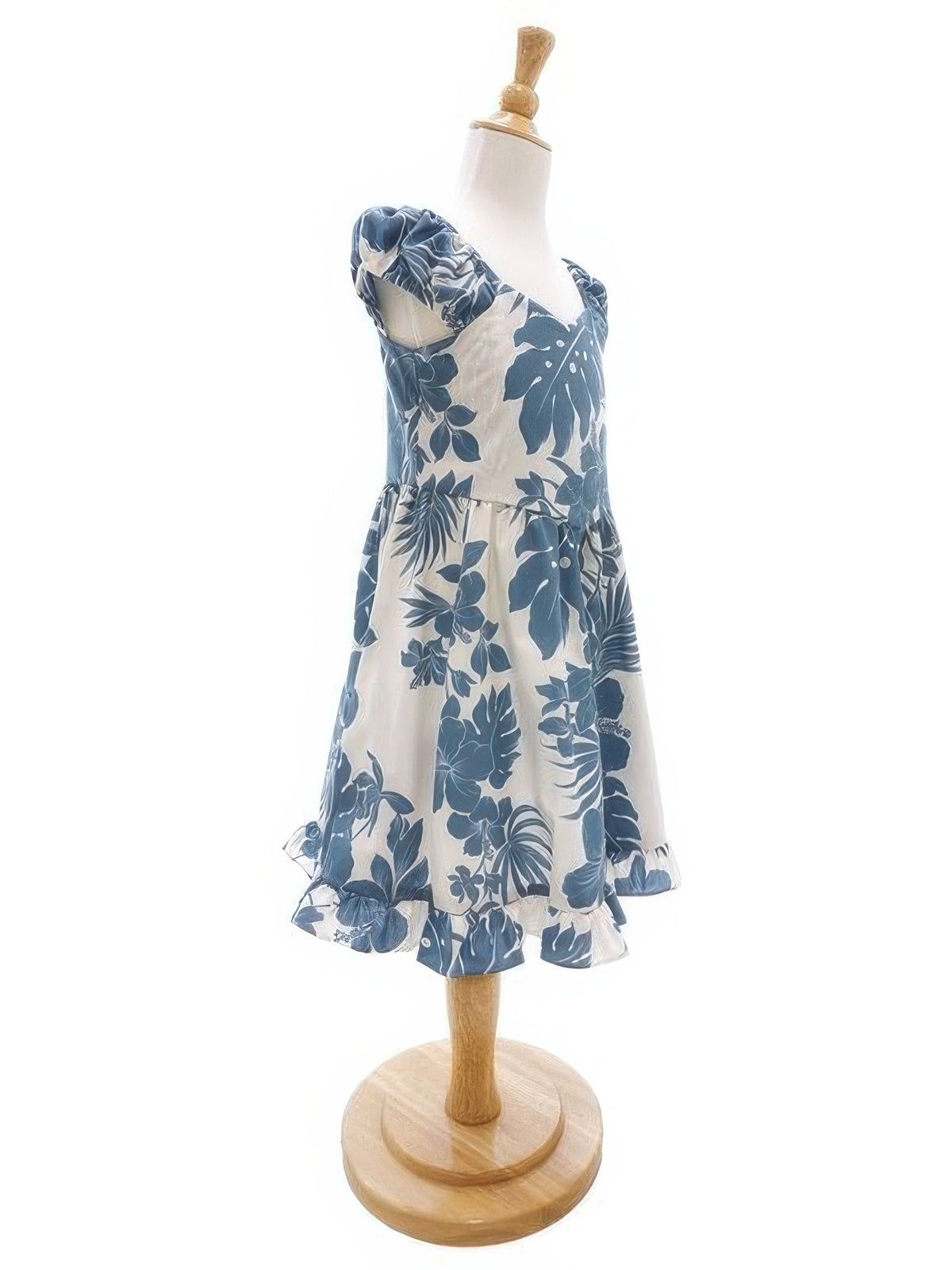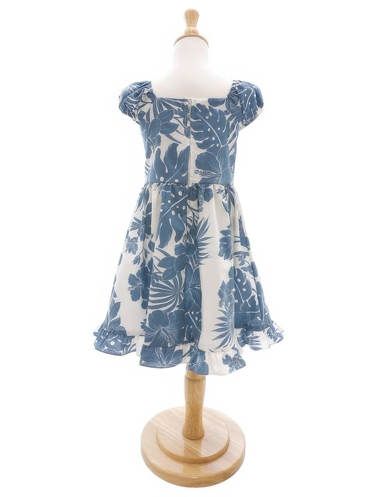 This charming Hawaiian sundress brings island style to young girls aged 1-12 with its vibrant hibiscus print on a soft blue poly-cotton blend. Crafted in Hawaii, the A-line silhouette features a convenient back zipper for easy dressing. The design pairs seamlessly with coordinating men's and women's pieces from the collection, allowing families to create unified Hawaiian-themed ensemble.