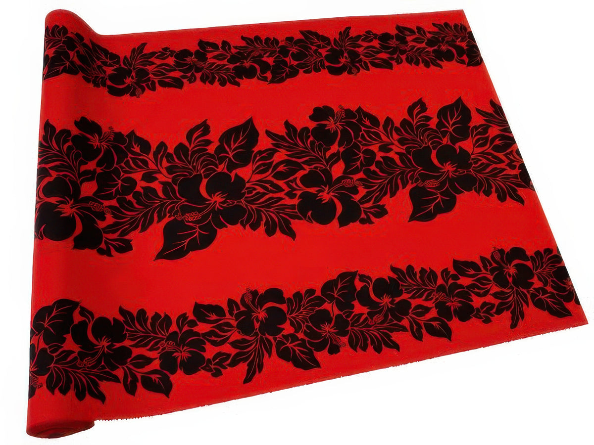 Introducing our Ka Makani Hibiscus Black & Red Poly Cotton Hawaiian fabric. Made from a polyester and cotton blend, this Hawaiian Fabric is perfect for making Pau Skirt and Dress. This fabric is machine washable. All fabrics ship directly from Hawaii.