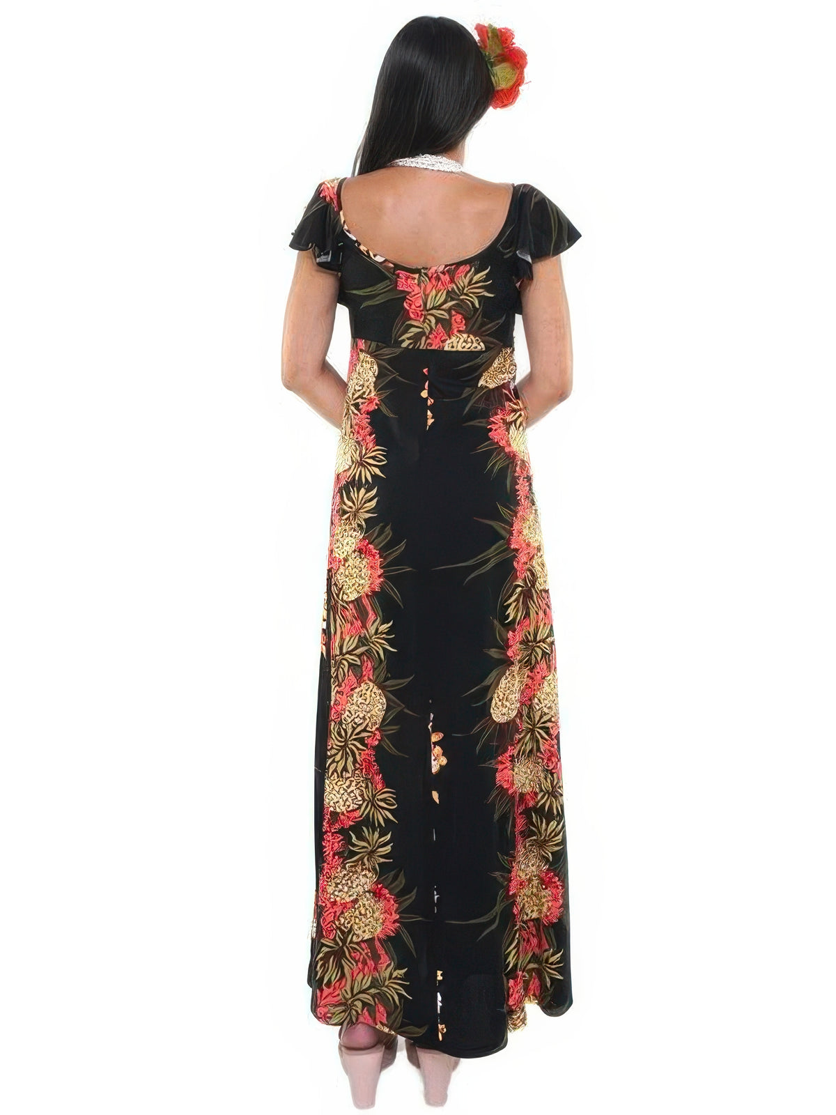 Hilo Hattie - Pineapple Panel Black Rayon Hawaiian Flutter Sleeve Empire Dress
