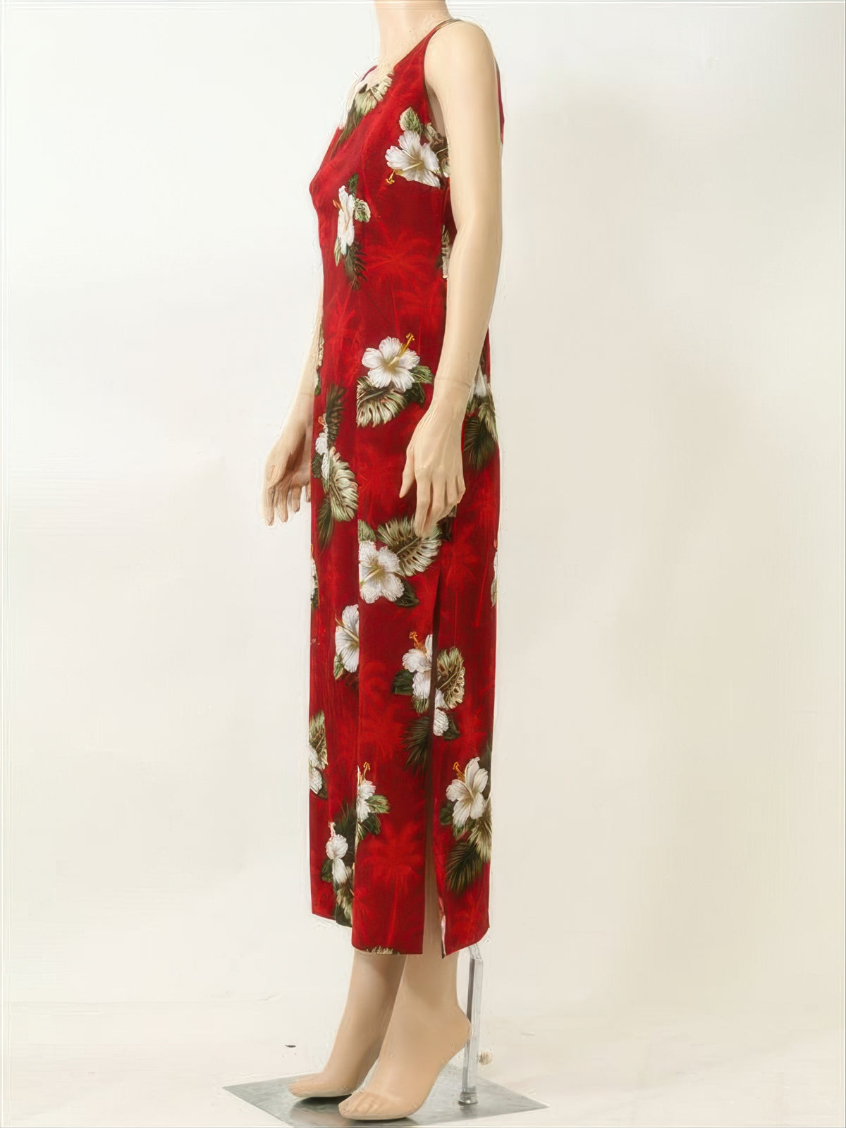 Pacific Legend - Hibiscus Monstera Red Cotton Hawaiian Tank Long Dress