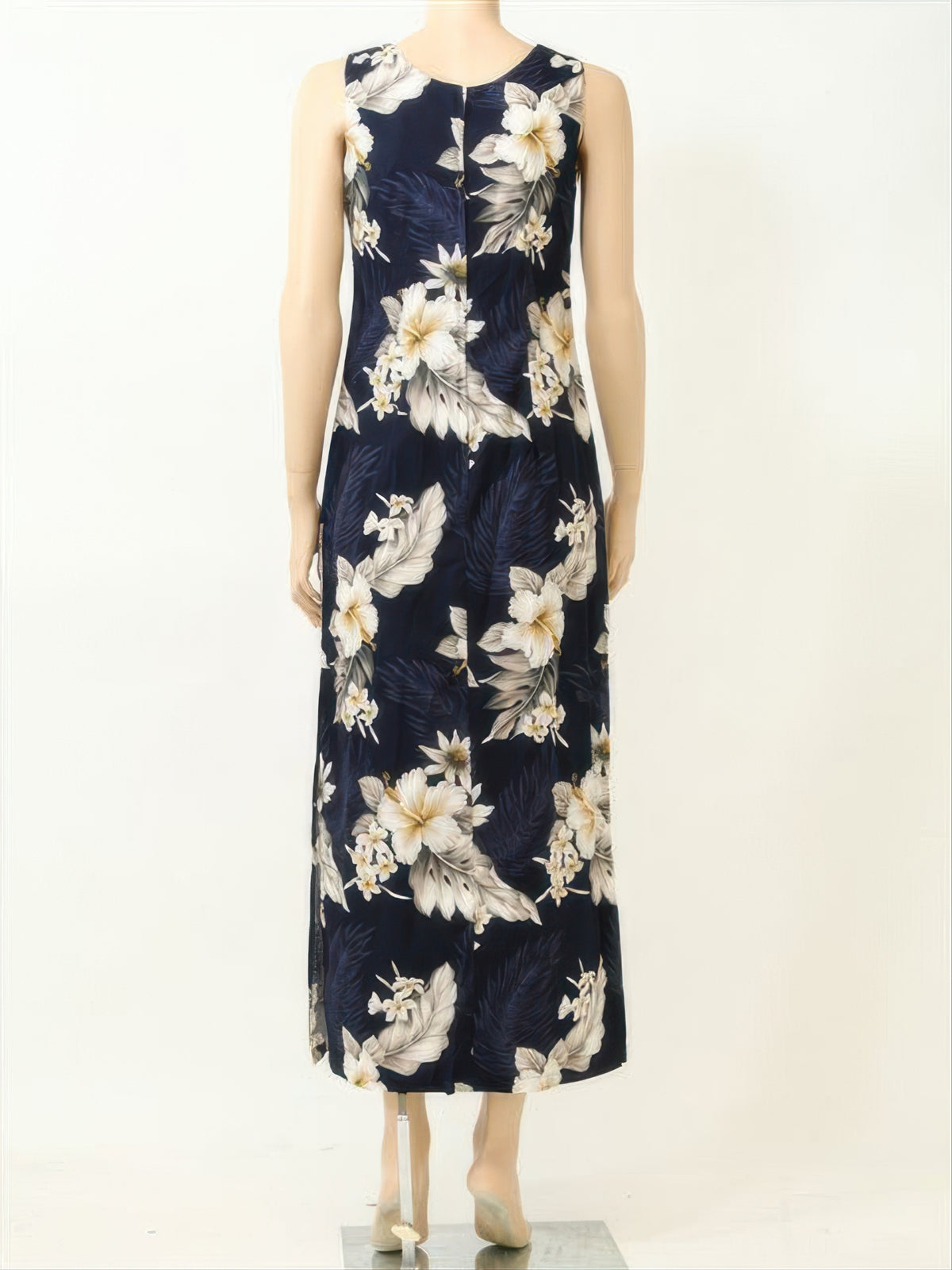 Crafted from 100% breathable cotton, this Hawaiian print long tank-style dress is perfect for warm, sunny days and special occasions alike. The back zipper allows for easy wear, while the 20-inch side slit offers freedom of movement with a touch of elegance.
