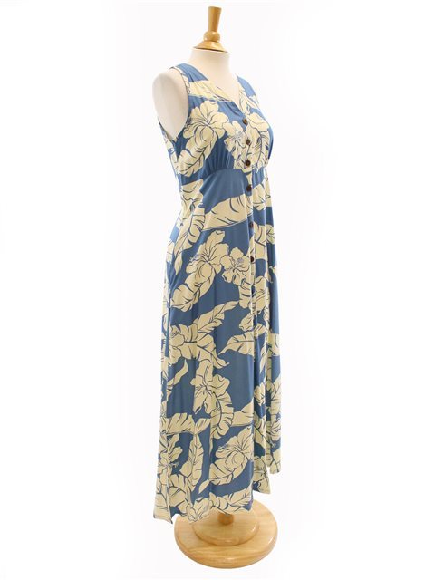 This dress has tank-top sleeves with a V-neck and a button-down front. The front buttons are made from real coconut husks and the waist includes an adjustable tie in the back. Two bottom side slits allow you to move freely while you wear the dress. It also includes two hidden side seam pockets for carrying small items.