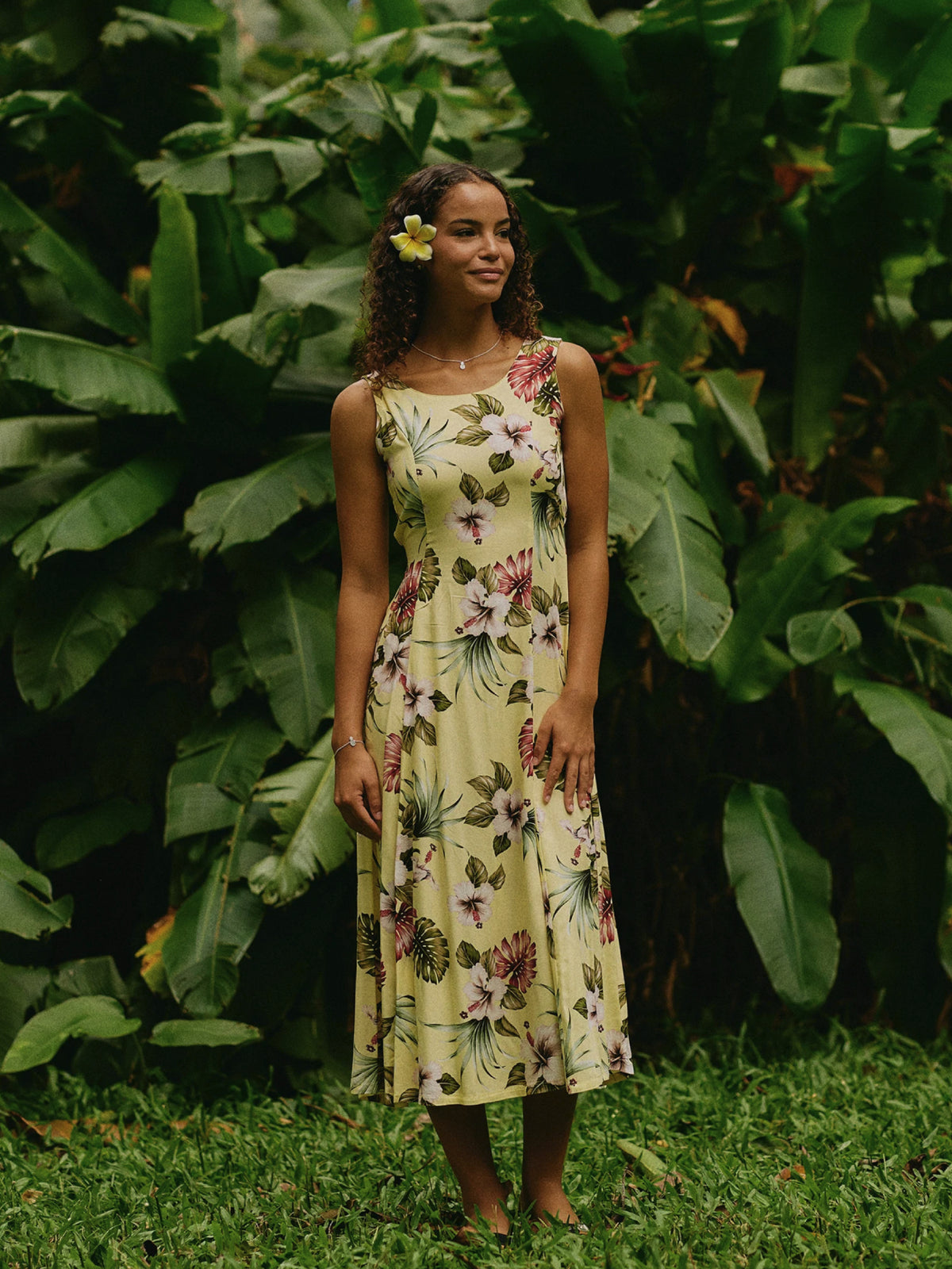 Royal Hawaiian Creations - Hibiscus & Monstera Light Yellow Rayon Hawaiian Sleeveless Back Tie Long Dress