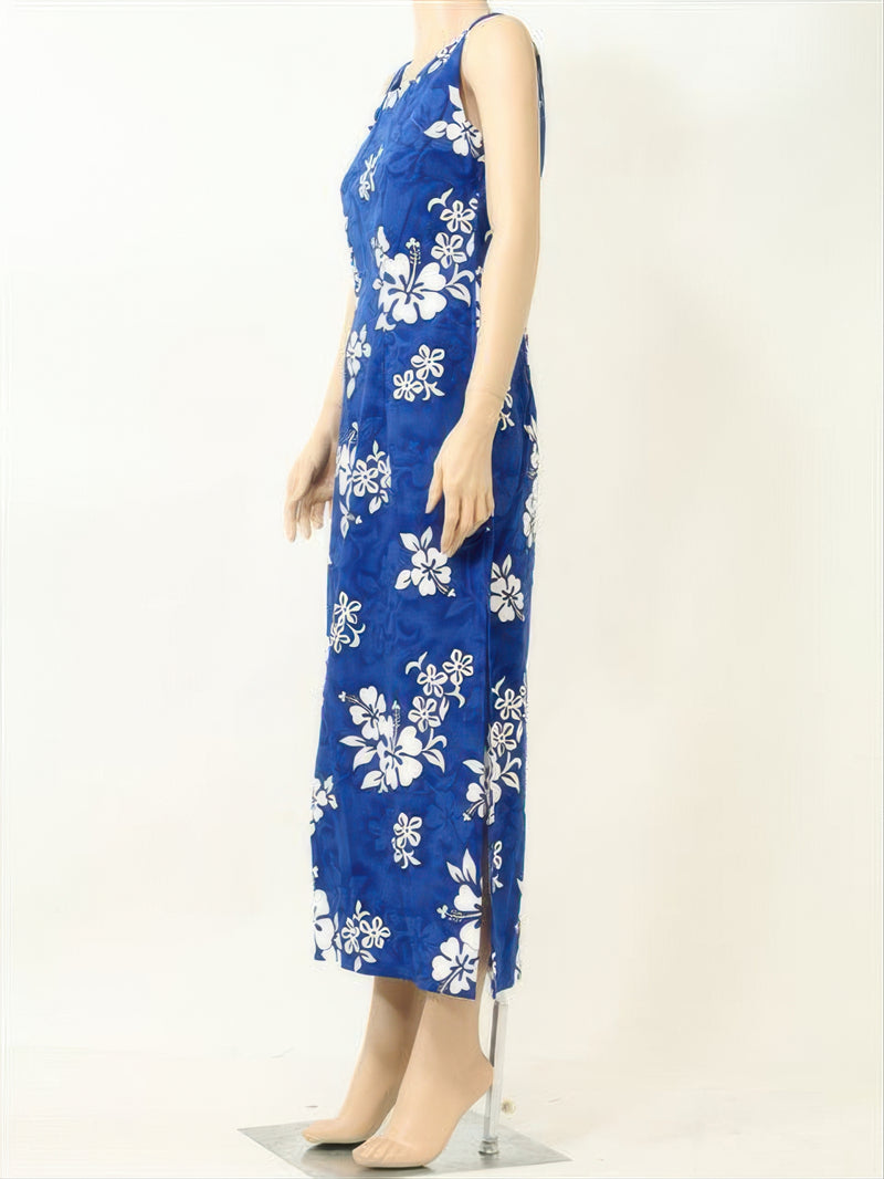 Pacific Legend - White Hibiscus Blue Cotton Hawaiian Tank Long Dress
