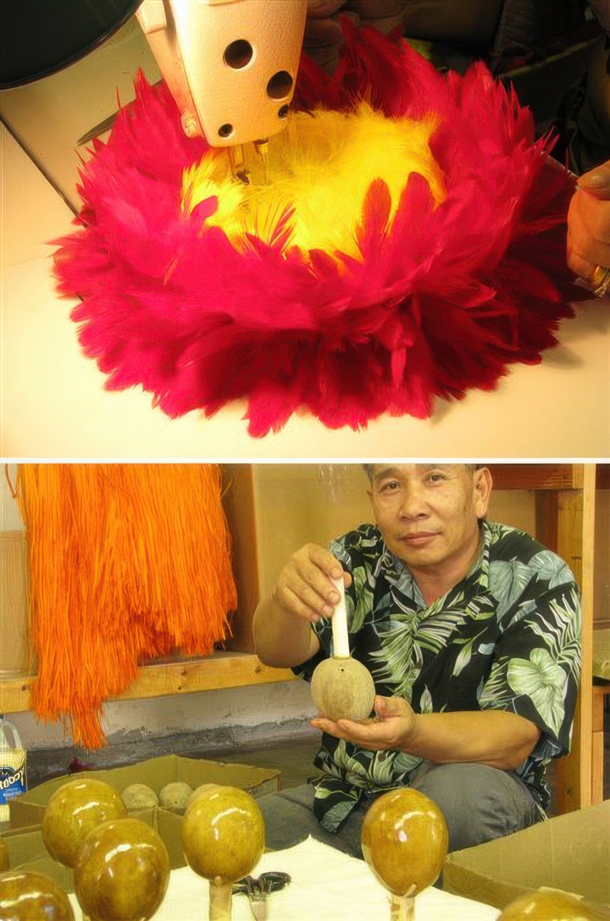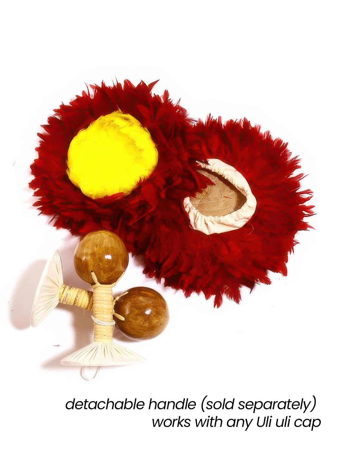 The `uli`uli are percussion instruments used by both male and female dancers, usually in high-paced rhythmic performances. Our `uli`uli have yellow feathered centers with surrounding red feathers.
