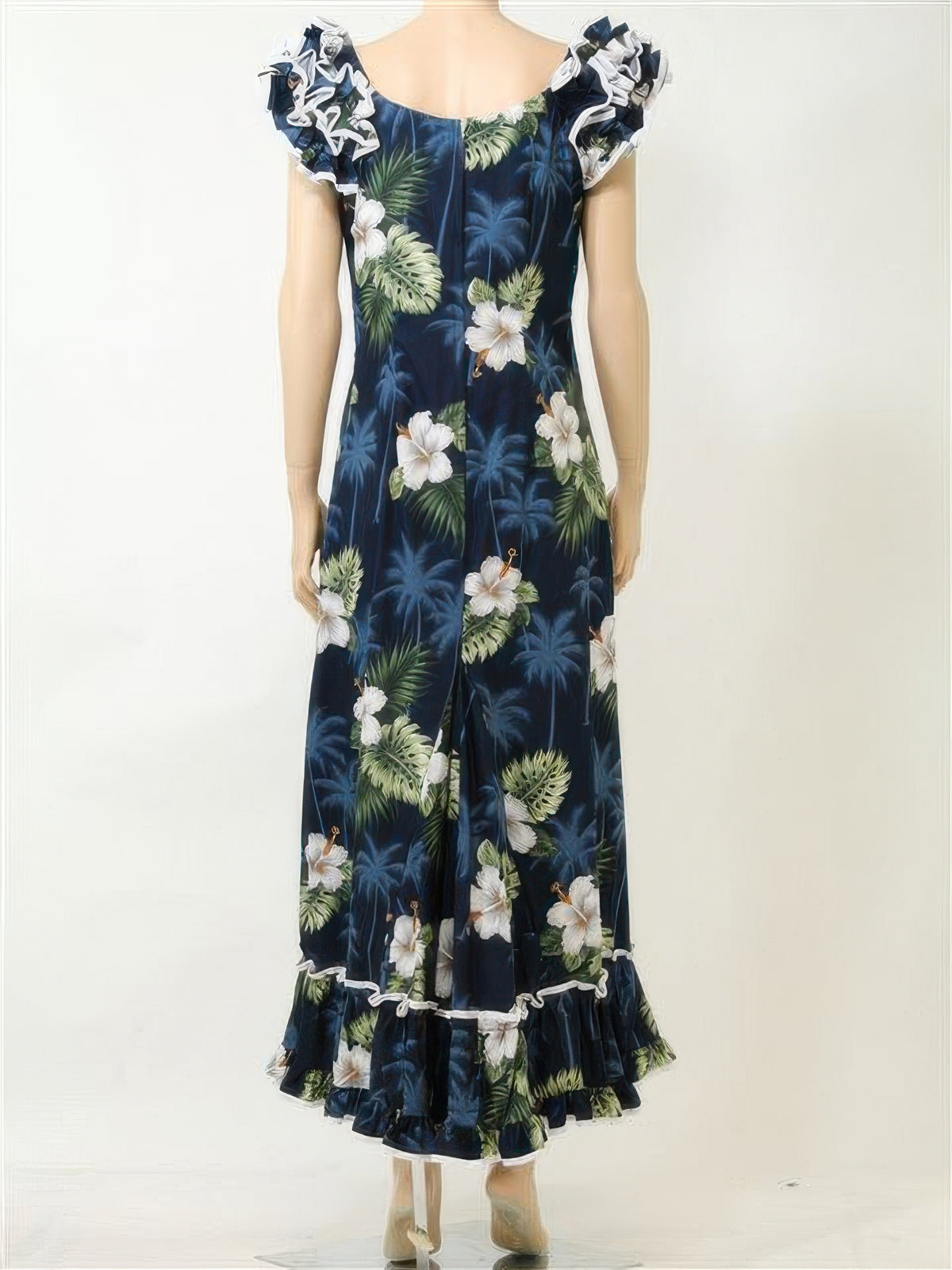 Pacific Legend - Monstera Navy Cotton Hawaiian Ruffle Long Muumuu Dress