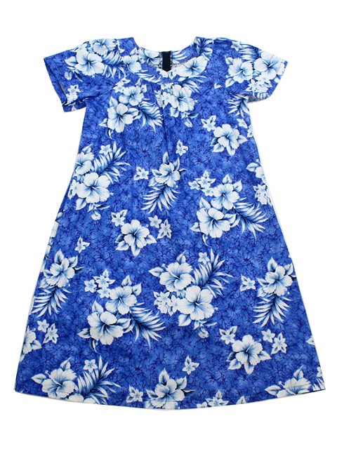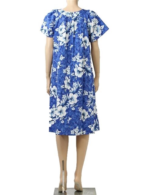 Step into tropical elegance with our Blue Cotton Hawaiian Midi Muumuu Dress, the perfect blend of comfort and style. Crafted from soft, breathable cotton, this dress is designed to keep you cool and relaxed while exuding effortless island charm. The vibrant blue fabric is adorned with a stunning array of hibiscus flowers in full bloom, adding a burst of color and a touch of exotic beauty.