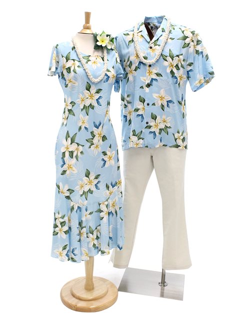 Expertly crafted in Hawaii, this Plumeria Light Blue Rayon Hawaiian Long Dress features a distinctive bottom ruffle that creates elegant movement. The thoughtfully designed sleeves offer modest coverage while maintaining the authentic island aesthetic. Its unstructured silhouette prioritizes comfort without sacrificing style. A practical back button closure facilitates effortless dressing. Complete the look with the coordinating men's shirt for perfect pair styling.