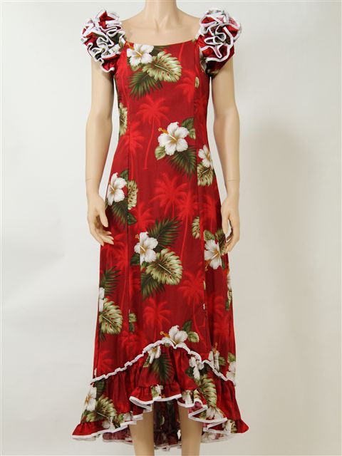 Pacific Legend - Hibiscus Red Cotton Hawaiian Ruffle Long Muumuu Dress