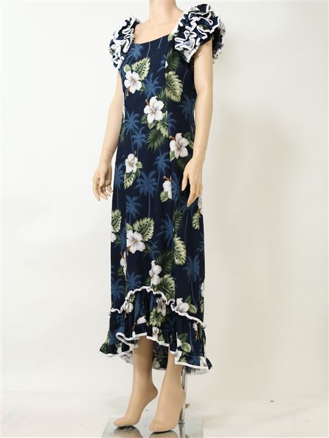 Pacific Legend - Monstera Navy Cotton Hawaiian Ruffle Long Muumuu Dress