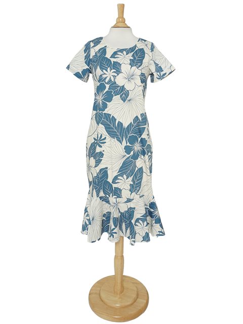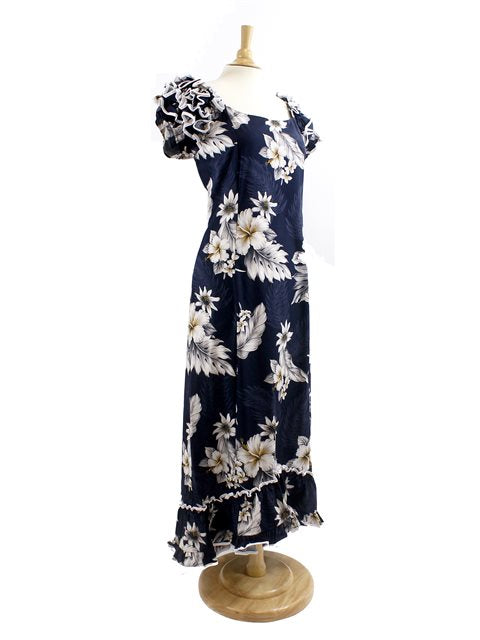 Pacific Legend - Hibiscus Navy Cotton Hawaiian Ruffle Long Muumuu Dress