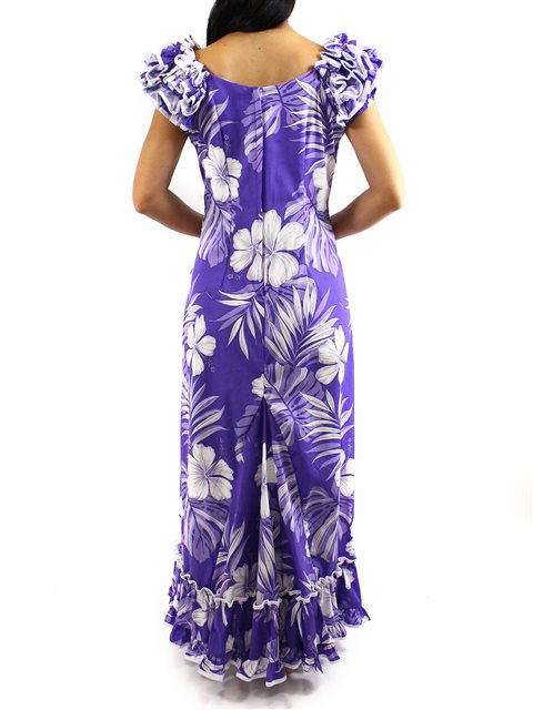 Pacific Legend - Hibiscus Purple Cotton Hawaiian Ruffle Long Muumuu Dress
