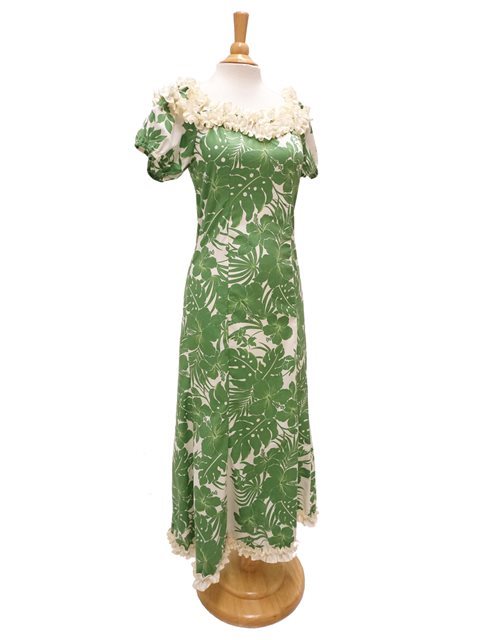 Anuenue - Monstera White Poly Cotton Hawaiian Nahenahe Ruffle Long Muumuu Dress