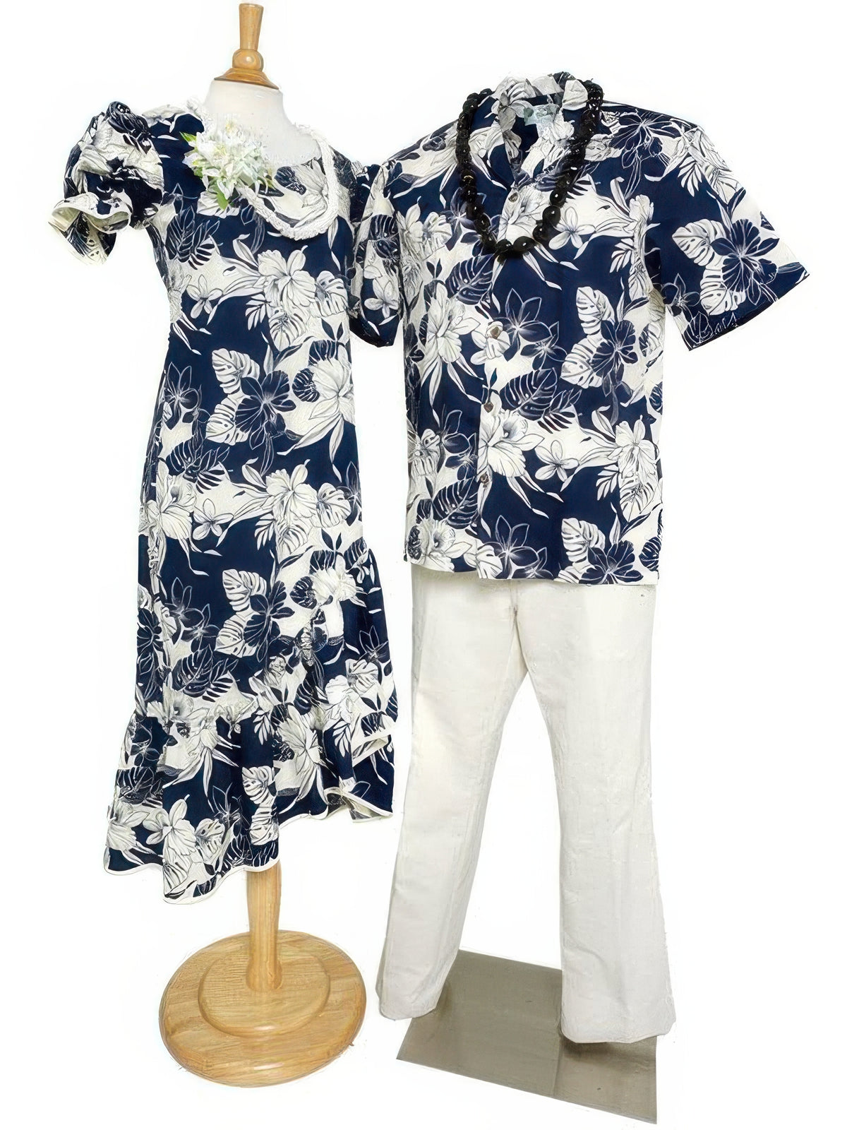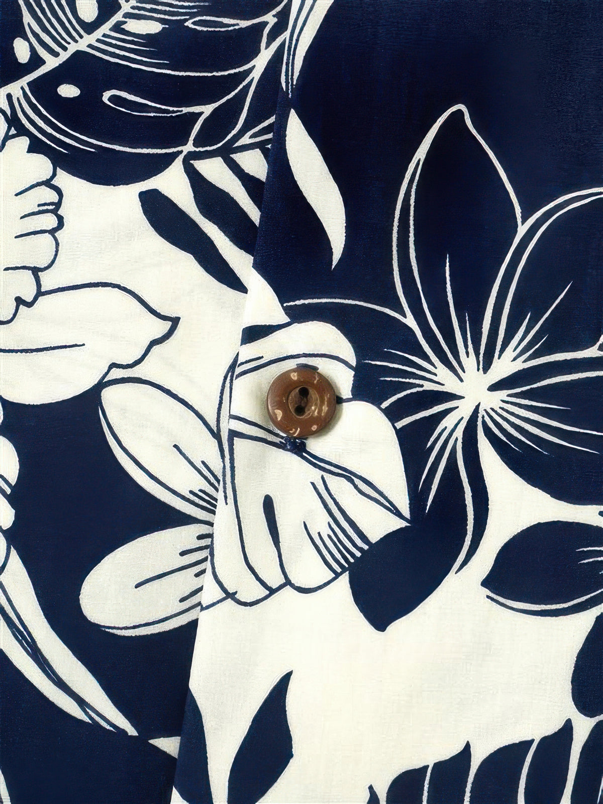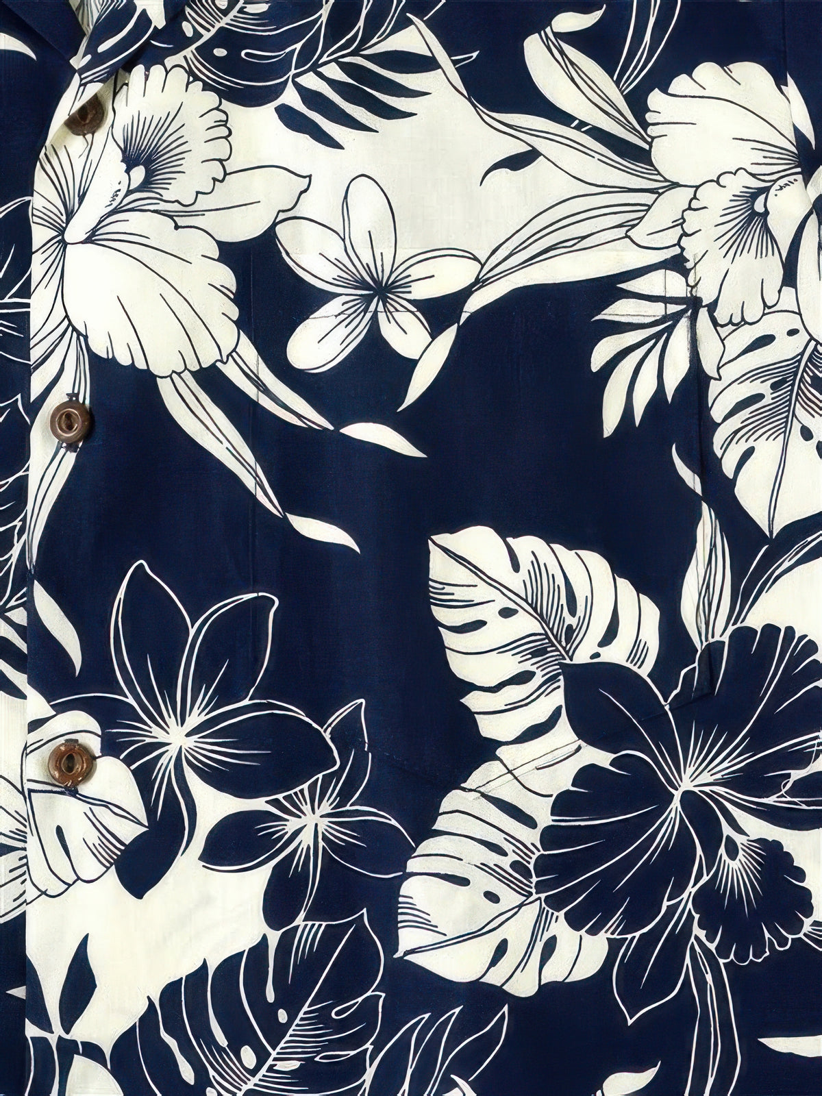 This striking navy Hawaiian shirt features an elegant orchid and monstera leaf design throughout. Constructed from breathable 100% cotton, it offers comfort and authentic island style. The coordinating chest pocket echoes the botanical print, creating a cohesive look. A matching women's dress is available to complete your coordinated ensemble.