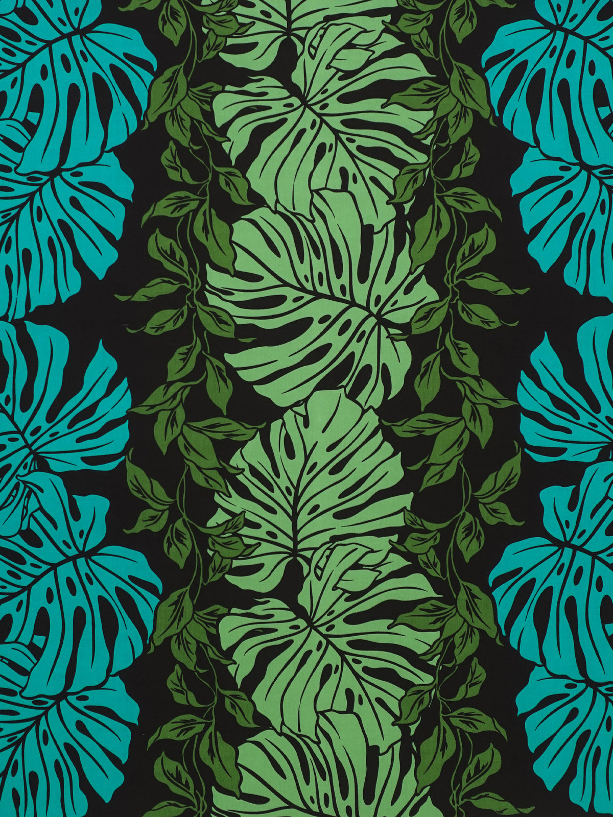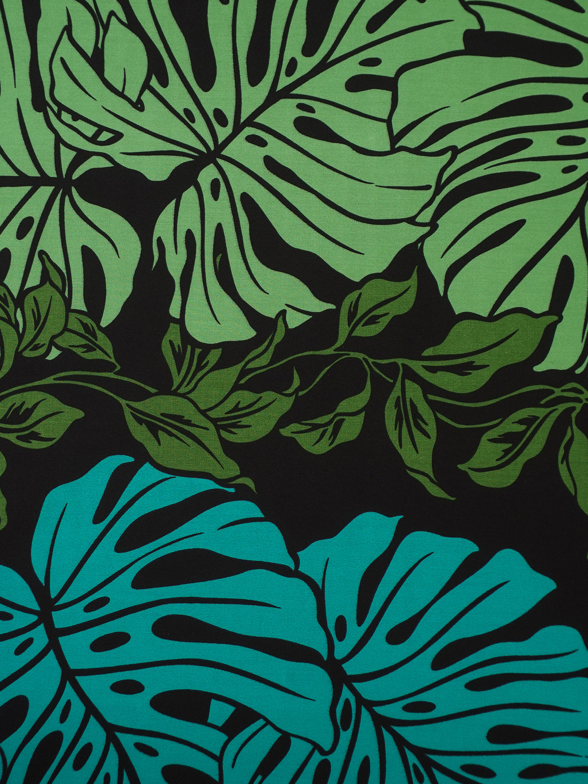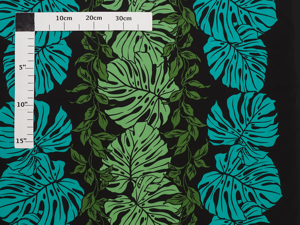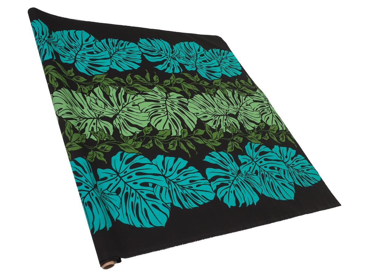 Ka Makani - Big Monstera Leaf Black & Green Poly Cotton Single Pau Skirt / 3 Bands