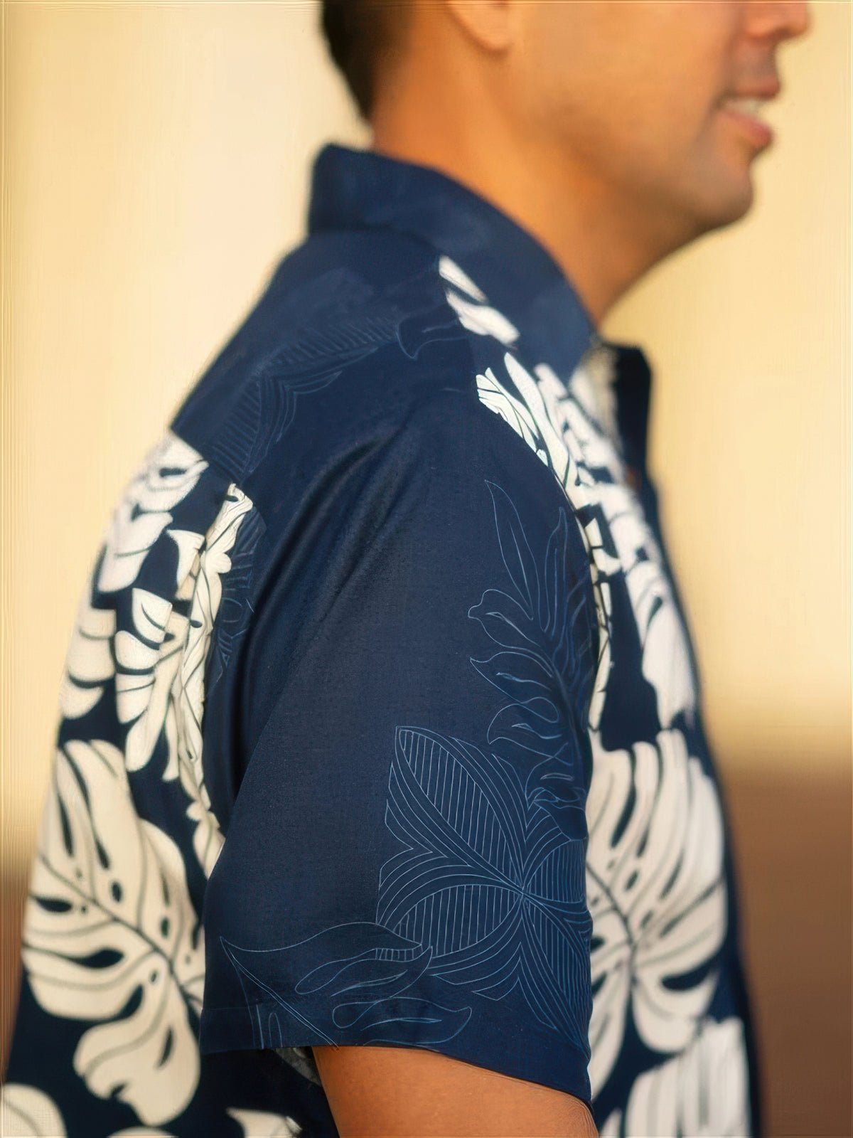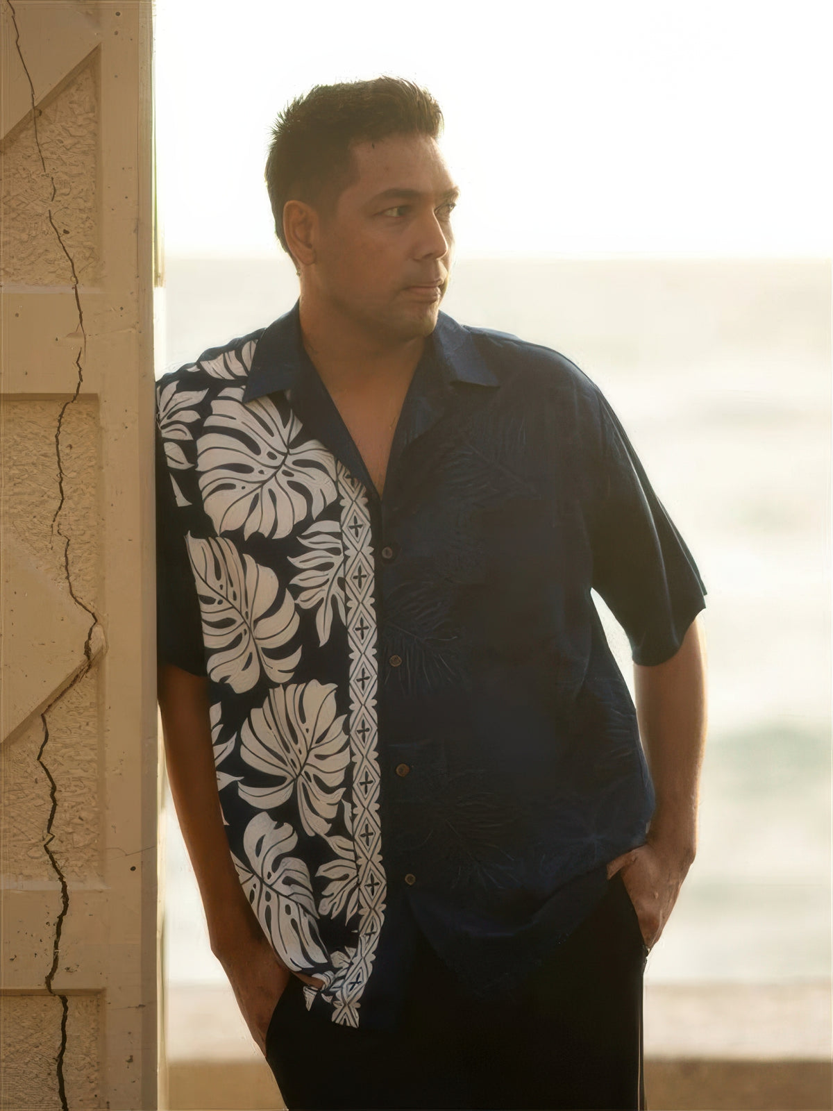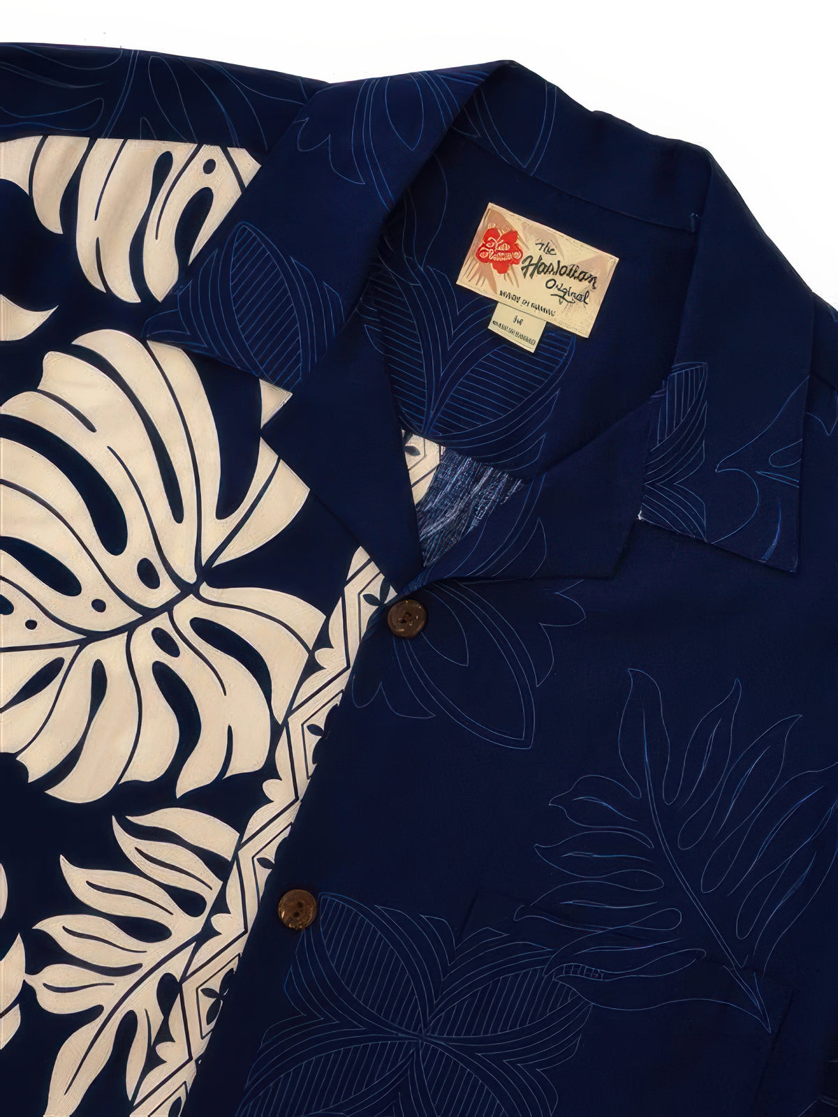 This Hawaiian shirt from the brand Hilo Hattie is made of 100% rayon. With white monstera leaf motifs on one panel and blue opposing panel also with monstera leaf motifs, this gorgeous shirt has a very strong and outstanding look to it. A neat feature of this shirt is the use of genuine coconut buttons. This look is great for casual and formal occasions.