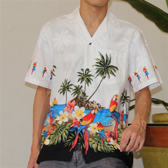 Pacific Legend - Parrot White Cotton Men's Border Hawaiian Shirt