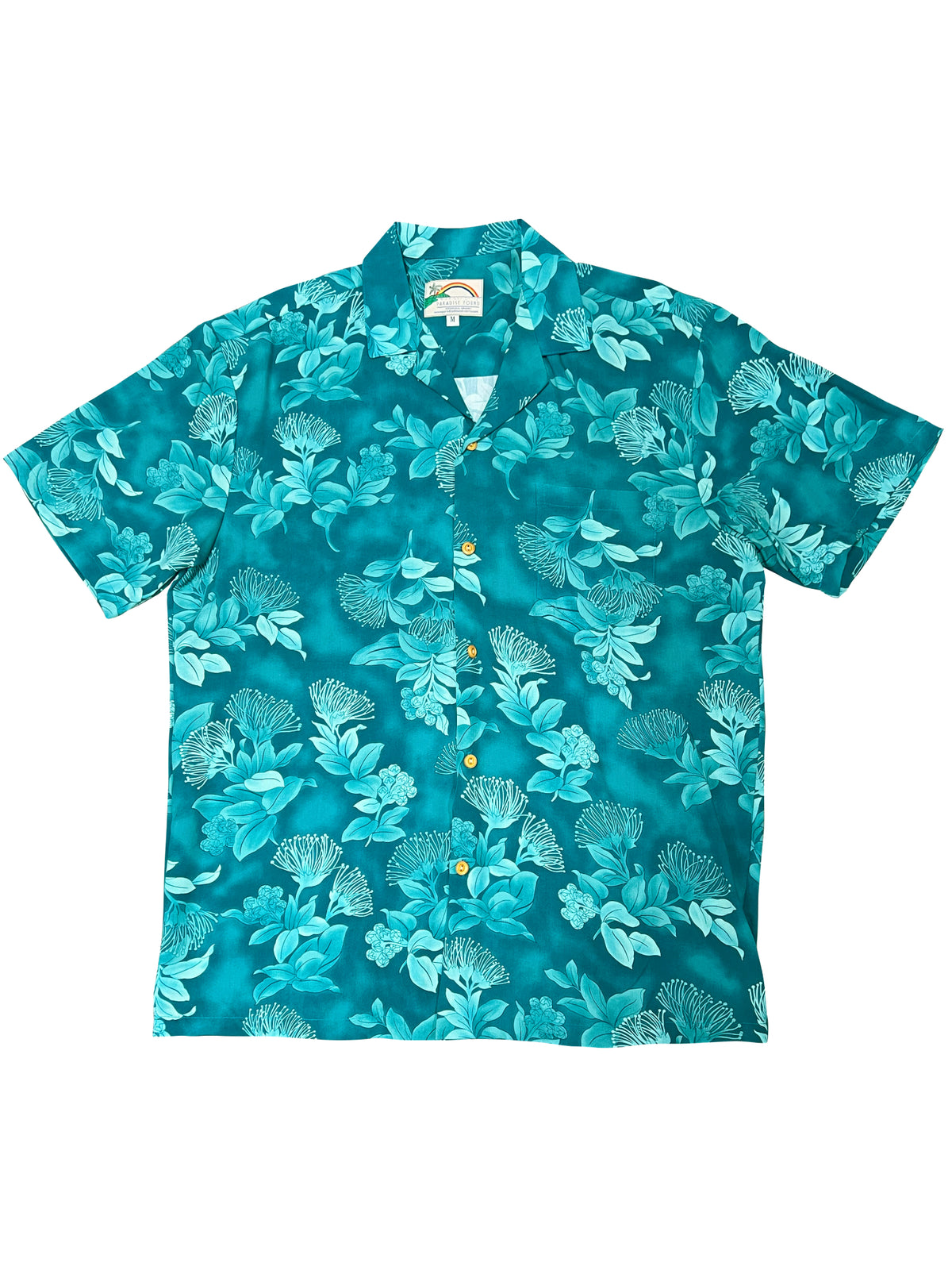 Show off your tropical yet understated vibe in this tone-on-tone Ohia Hawaiian shirt in turquoise. This prints features Ohia flowers and foliage on a lush turquoise background for a classy relaxed look. This premium Hawaiian shirt is made of 100% super soft rayon and comes with a matched pocket and real wood buttons.
