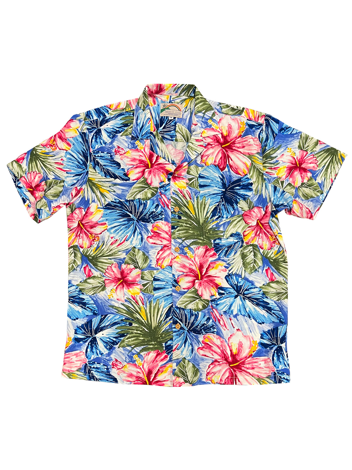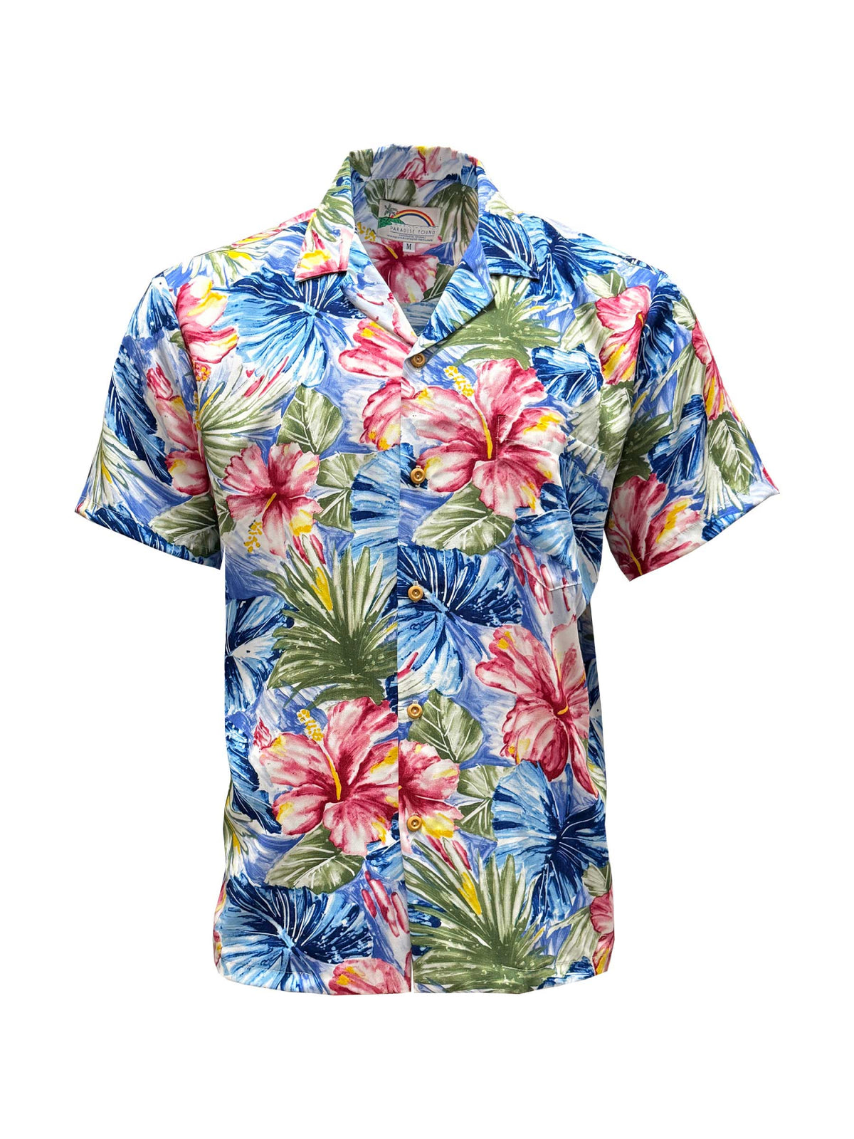 Add a splash of Hawaiian tropics to your wardrobe with our Painted Hibiscus Hawaiian shirt in blue. This colorfully bold print features the iconic hibiscus flower in a hand-painted style that provides a juicy burst of color, making it a perfect choice for any festive occasion. Embrace the vibrant and tropical vibes with this eye-catching Aloha shirt.