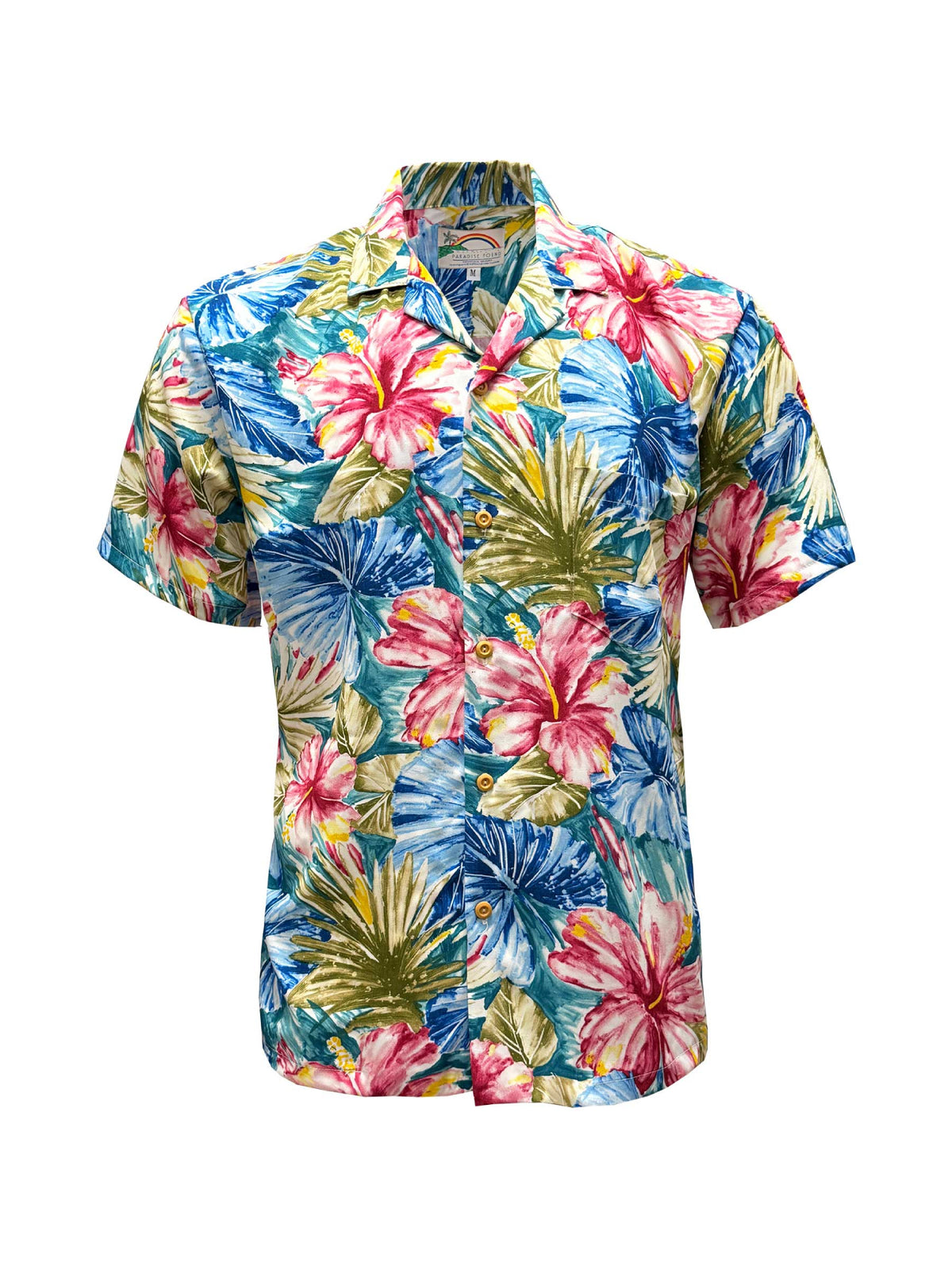 Add a splash of Hawaiian tropics to your wardrobe with our Painted Hibiscus Hawaiian shirt in teal. This colorfully bold print features the iconic hibiscus flower in a hand-painted style that provides a juicy burst of color, making it a perfect choice for any festive occasion. Embrace the vibrant and tropical vibes with this eye-catching Aloha shirt.