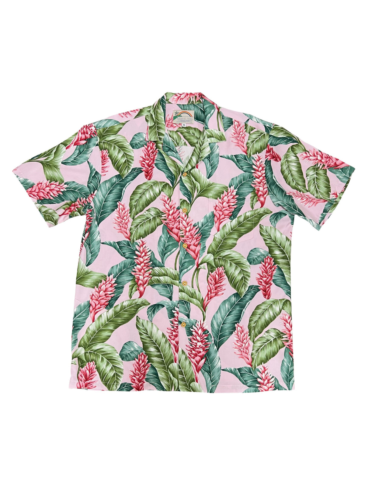 Elevate your tropical style instantly with this striking Red Ginger - Pink aloha shirt. This print showcases vibrant red ginger blooms against a cheerful pink background, creating an uplifting visual impact. Perfect for both casual gatherings and dressier aloha events, this versatile shirt delivers comfort and relaxed island style.