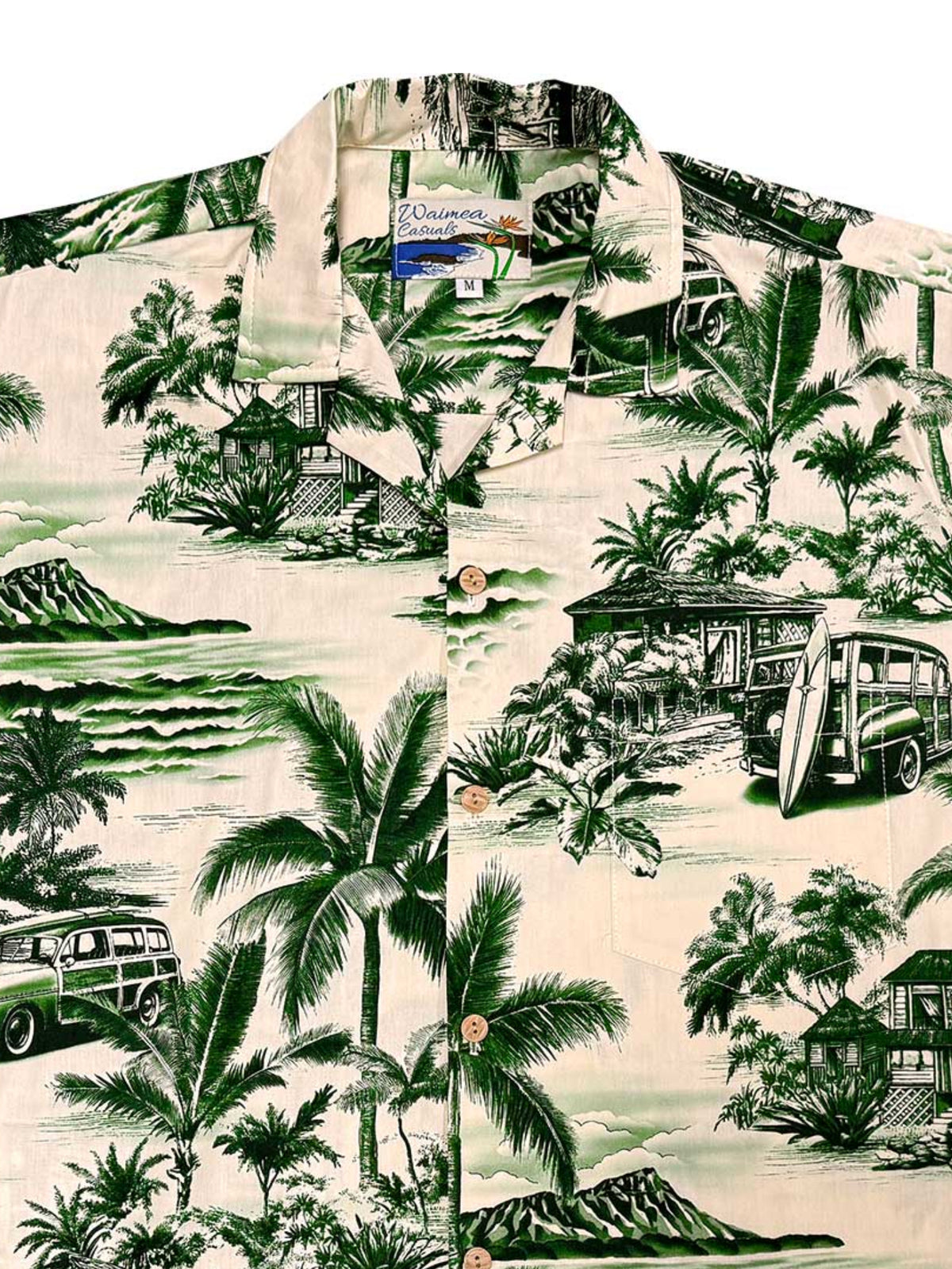 Embrace island vibes with the Paradise Woody Hawaiian shirt in green. Crafted from 100% cotton, this vintage-inspired Aloha shirt features classic Woodie and surfboard motifs on the beach with iconic Diamond Head in the background. Perfect for casual outings or beach days, it offers breathable comfort and timeless style that transports you the romantic days of Old Hawaii.