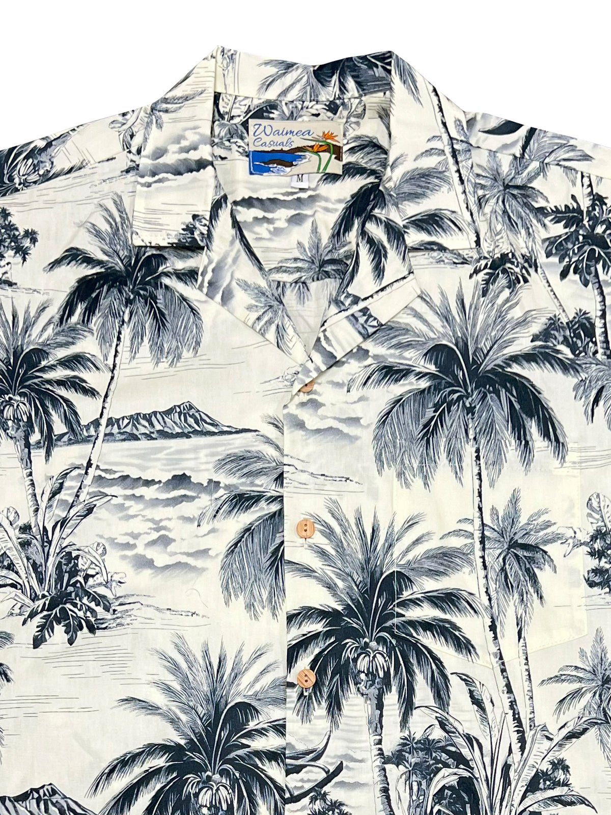 Enjoy the nostalgia of Waikiki Beach in charcoal with this scenic Aloha shirt featuring Diamond Head overlooking a canoe off the sands of Waikiki. Bring the calming touch of old school tropics to your next casual event.