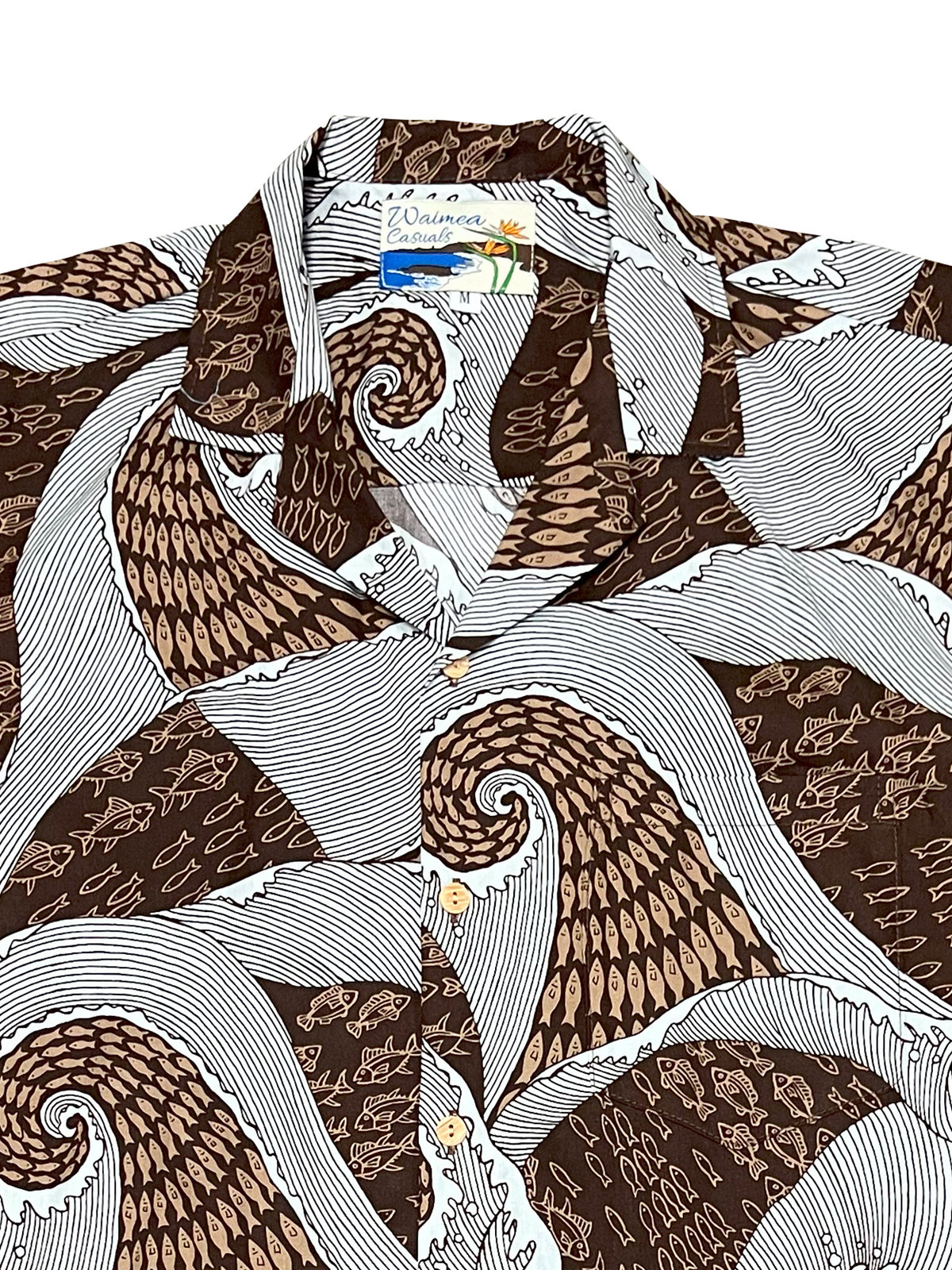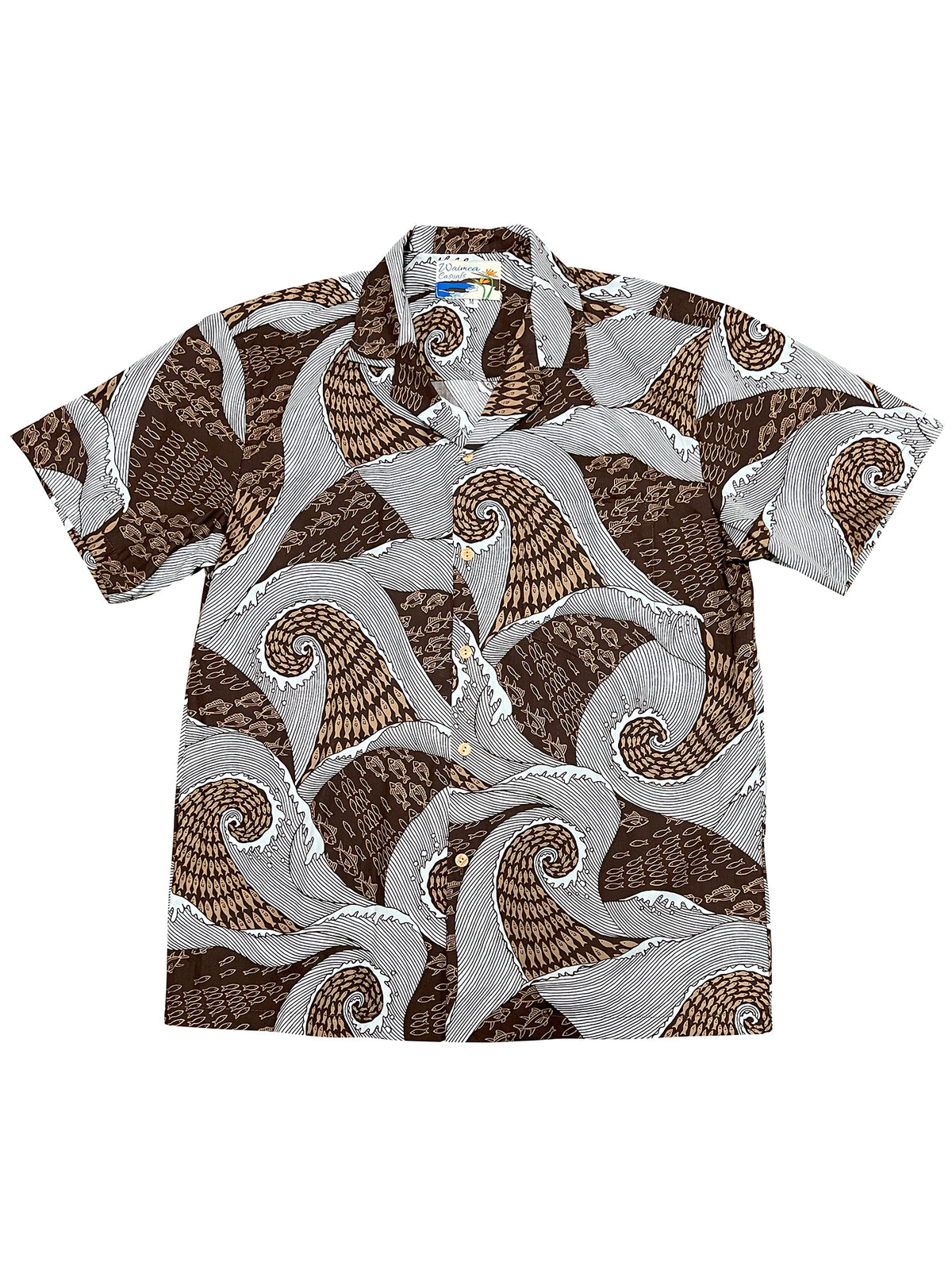 Indulge in this artful Waves Aloha shirt in brown. The mesmerizing wave pattern and playful little fish create a fun beach vibe. This shirt pays homage to the ocean culture of Hawaii without the more traditional look of other Aloha shirts.
