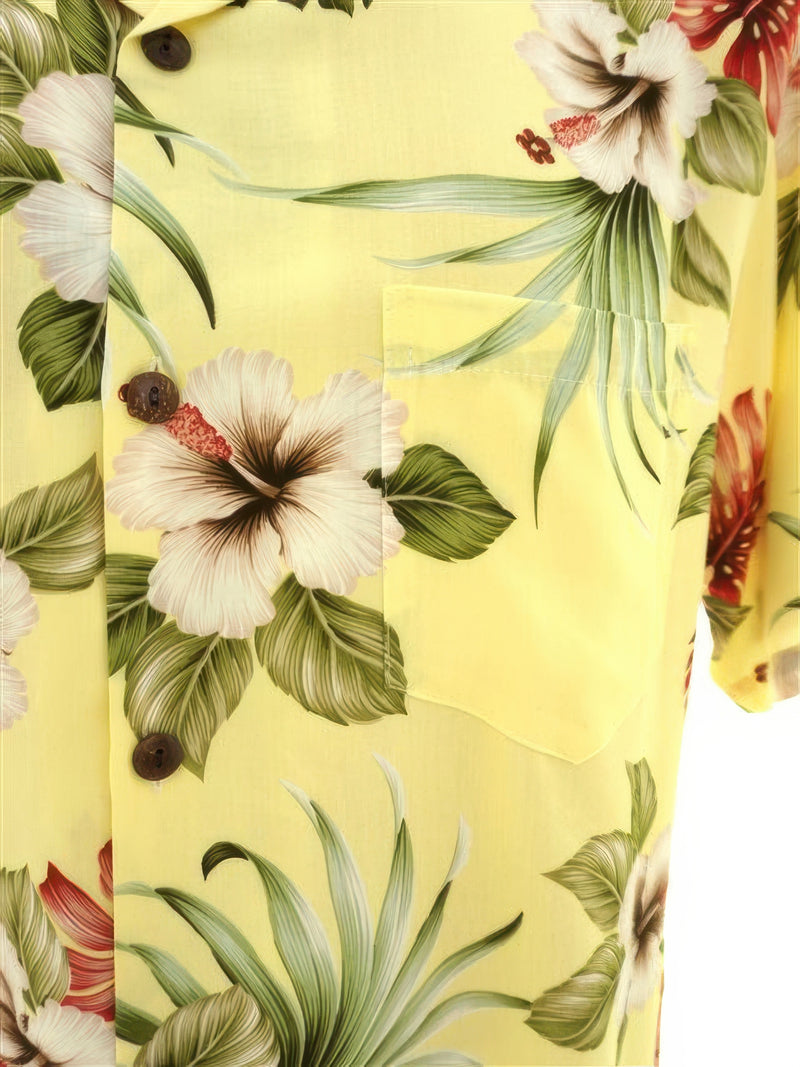 Royal Hawaiian Creations - Hibiscus & Monstera Light Yellow Rayon Men's Hawaiian Shirt