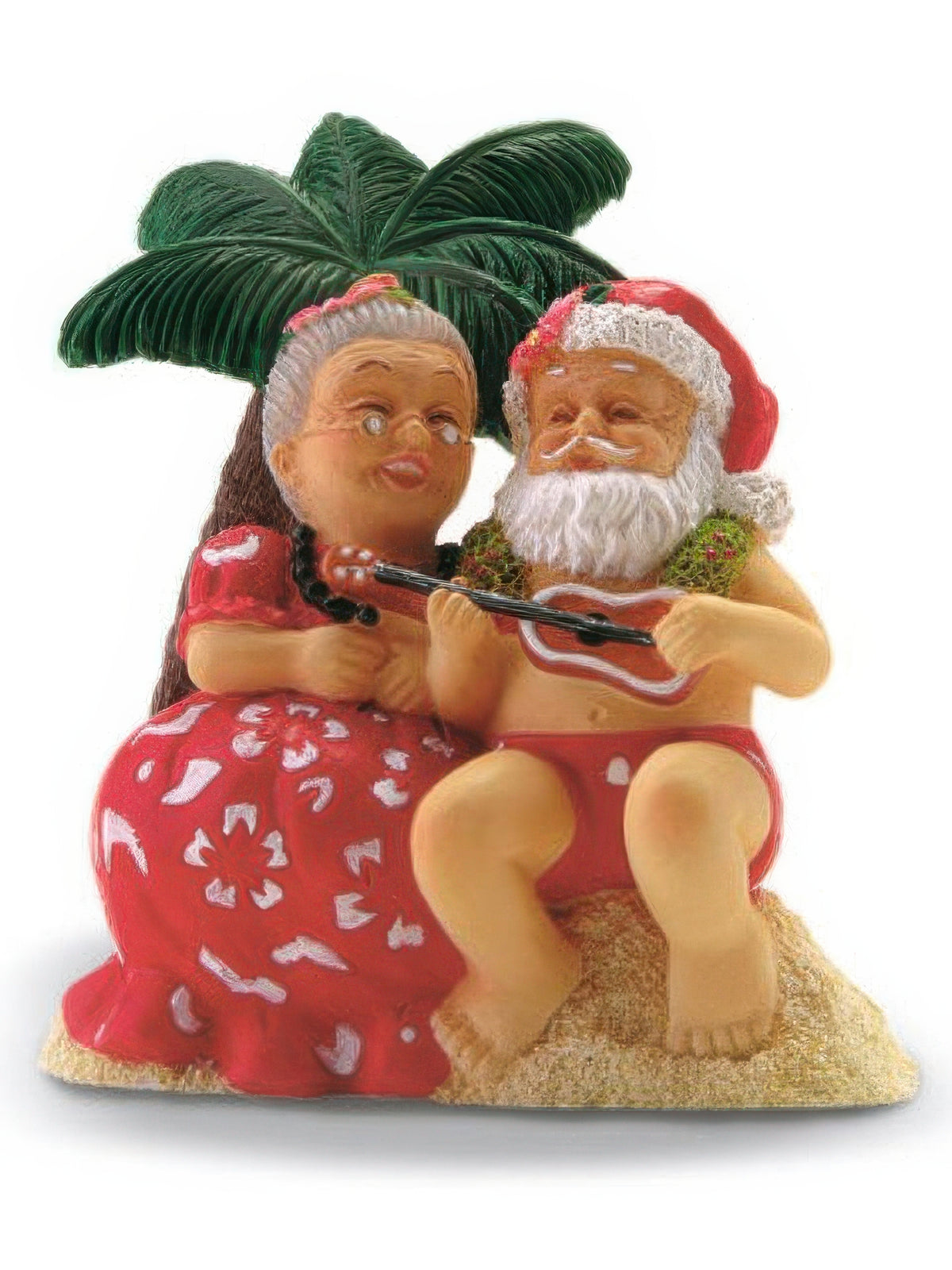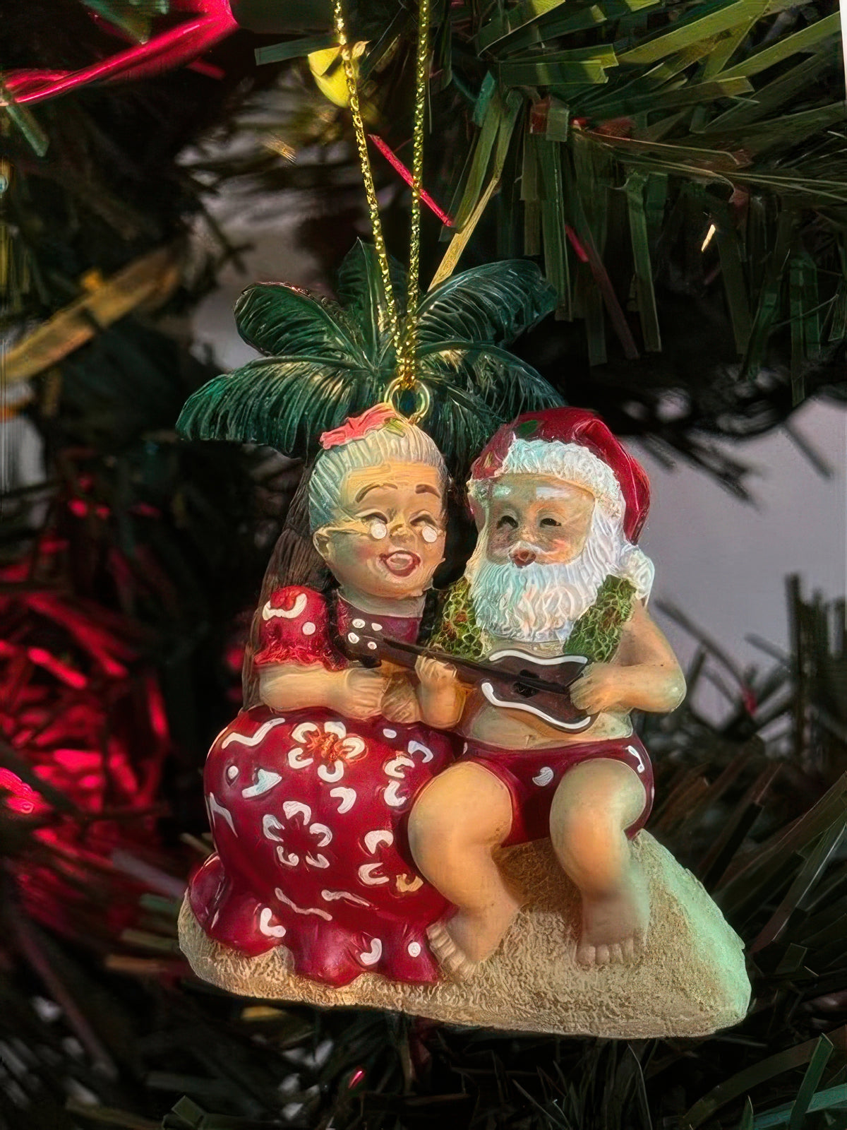 A cute Hawaiian santa adores misses claus with a smooth song in your festive muumuu. A fun and delightful ornaments make great gift toppers too!