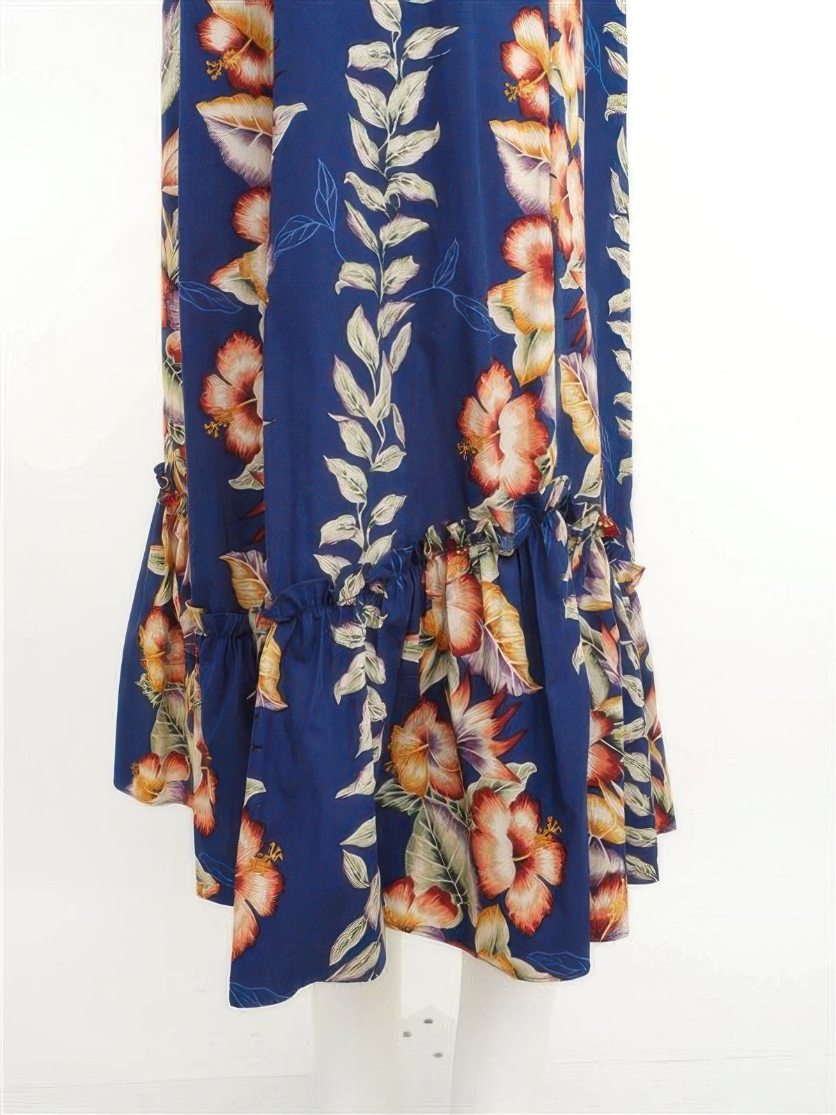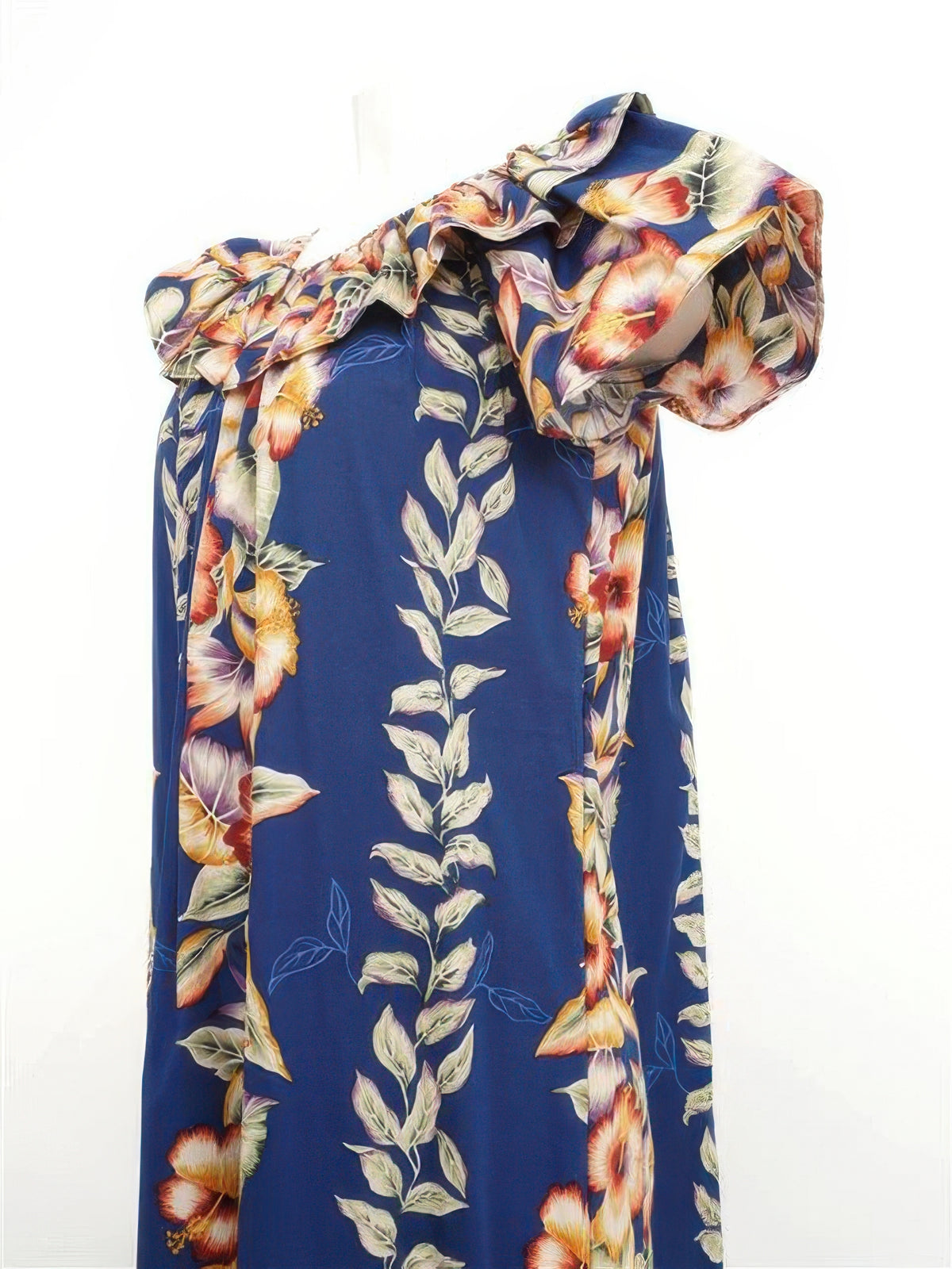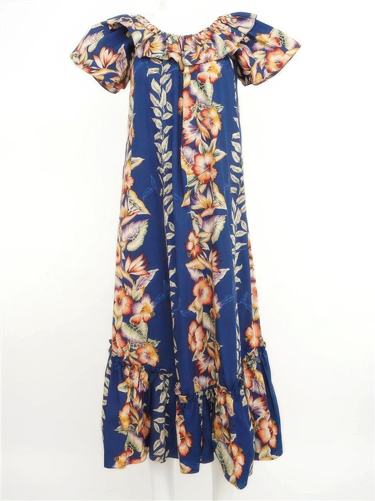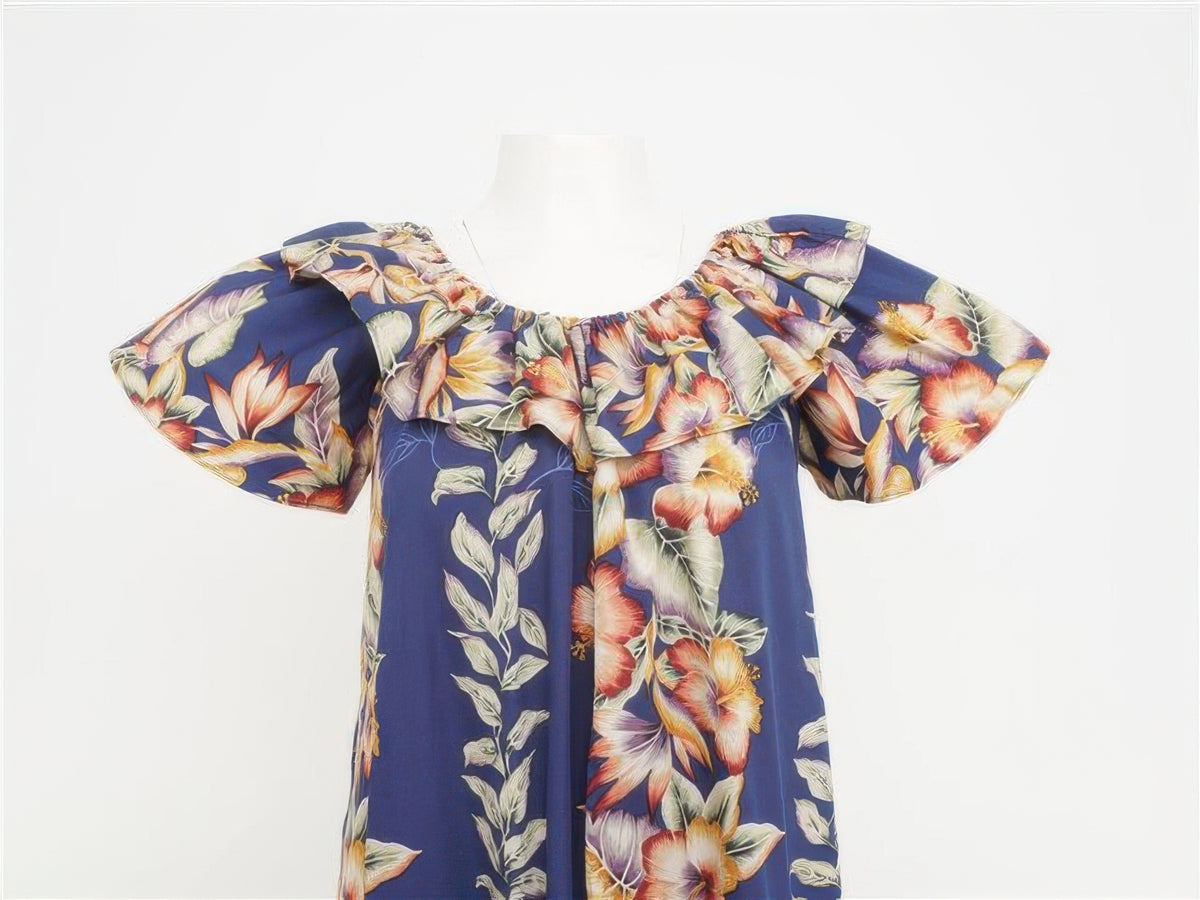 Crafted by KY's International Fashion, this navy cotton muumuu showcases a timeless anthurium and hibiscus floral pattern. The A-line silhouette drapes gracefully, offering unrestricted movement and a refined aesthetic suitable for formal occasions, celebrations, or relaxed gatherings.