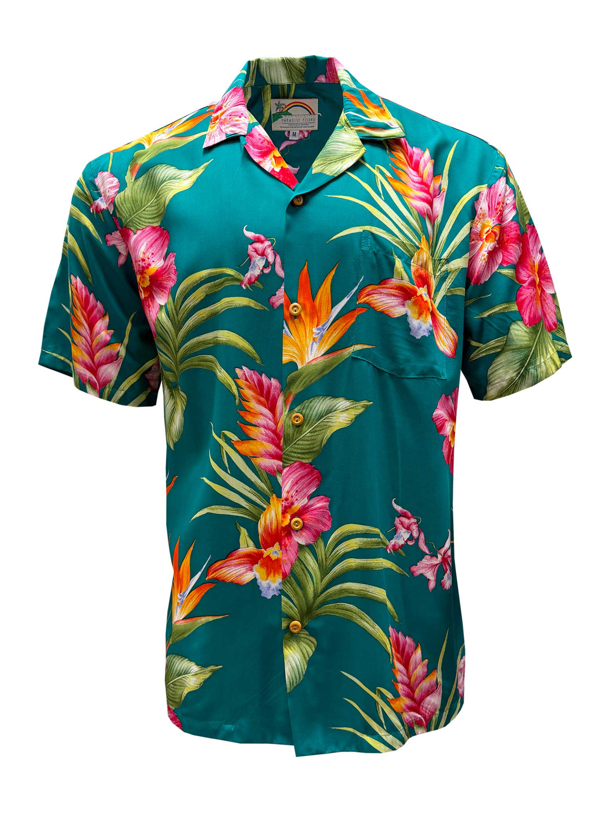 Embrace island life with the Blooms in Paradise aloha shirt in tropical cyan. This vibrant design celebrates the tropical beauty of Hawaii with stunning bird of paradise, orchid, and hibiscus florals that bring island color to life. Crafted in Hawaii from 100% rayon, it offers a soft, breathable feel perfect for warm weather. The matched pocket with wood buttons adds authentic island charm.