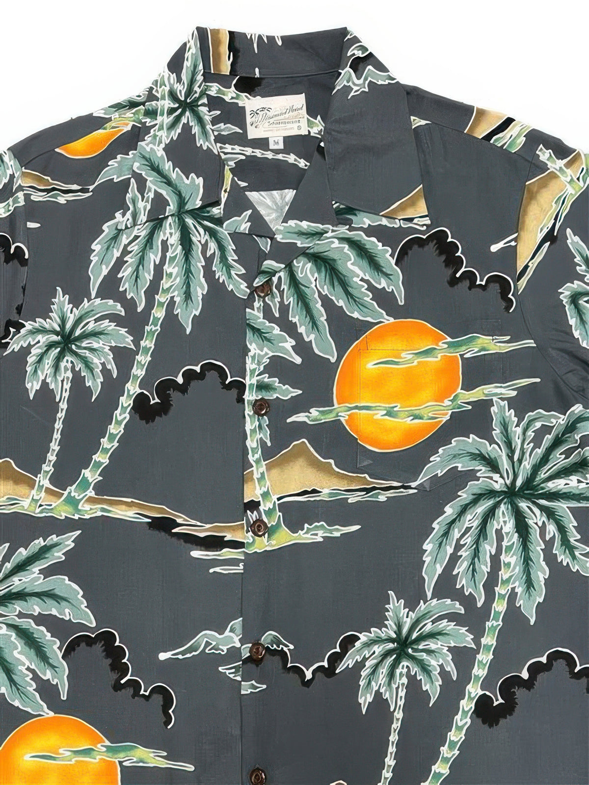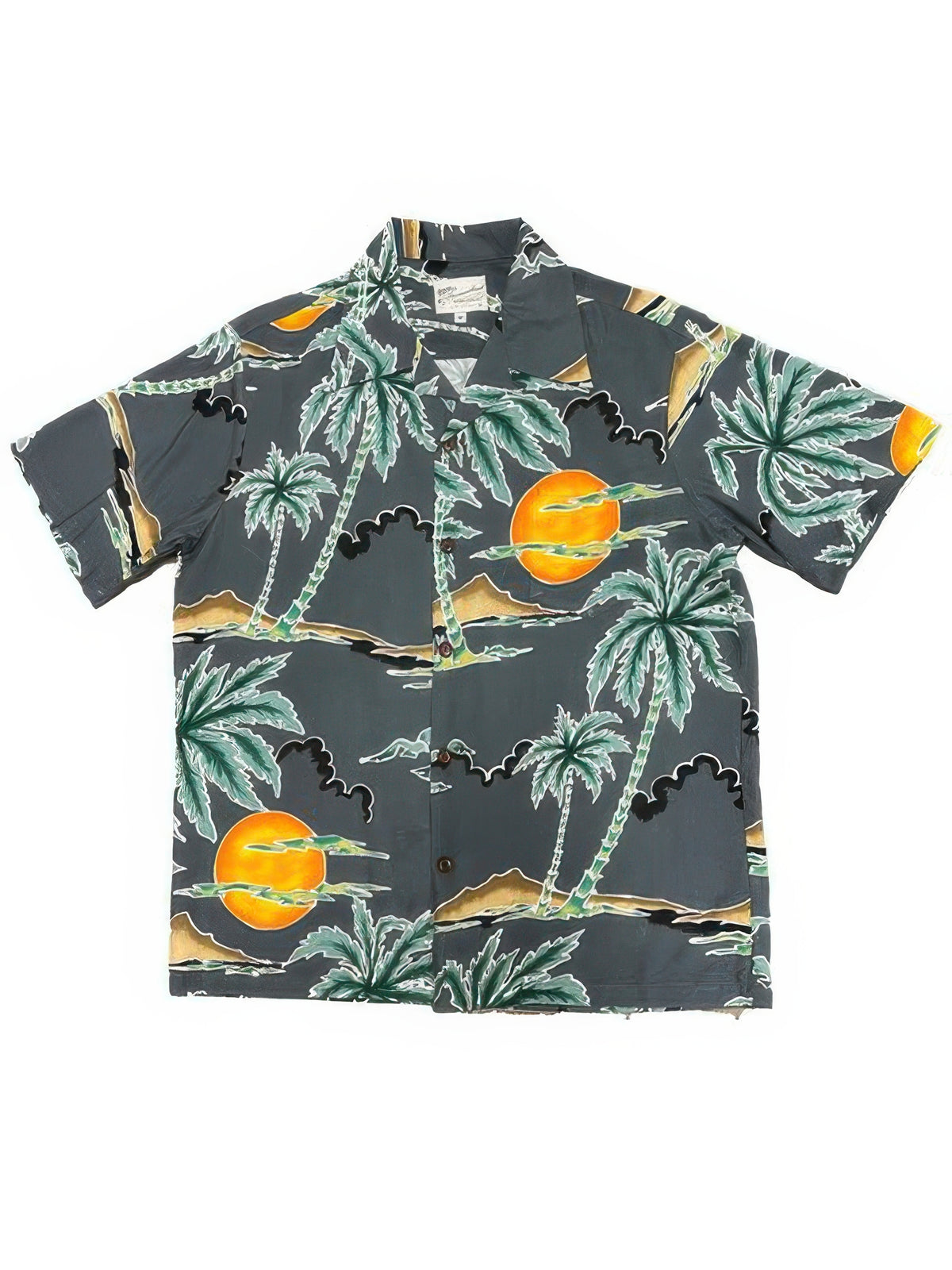 Embrace the allure of a bygone era with the Retro Scenic Palm shirt in Charcoal. Adorned with the famous Diamond Head and retro palm trees, this vintage-style piece transports you to the iconic sands of Waikiki beach. Experience luxury and escape to Paradise with this timeless piece. This stunning shirt is made of 100% rayon and has a matched pocket and real coconut buttons.