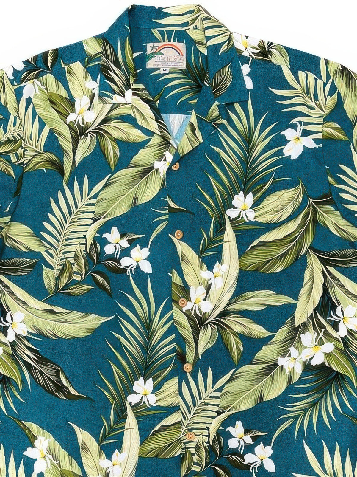 Exude tropical confident in this White Ginger Aloha shirt featuring tropical foliage and white ginger on a jade background. This premium Hawaiian shirt is made of 100% super soft rayon and comes with a matched pocket and real wood buttons.