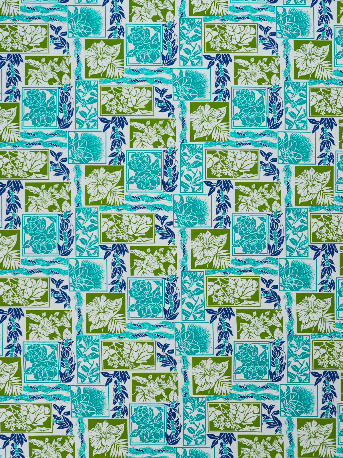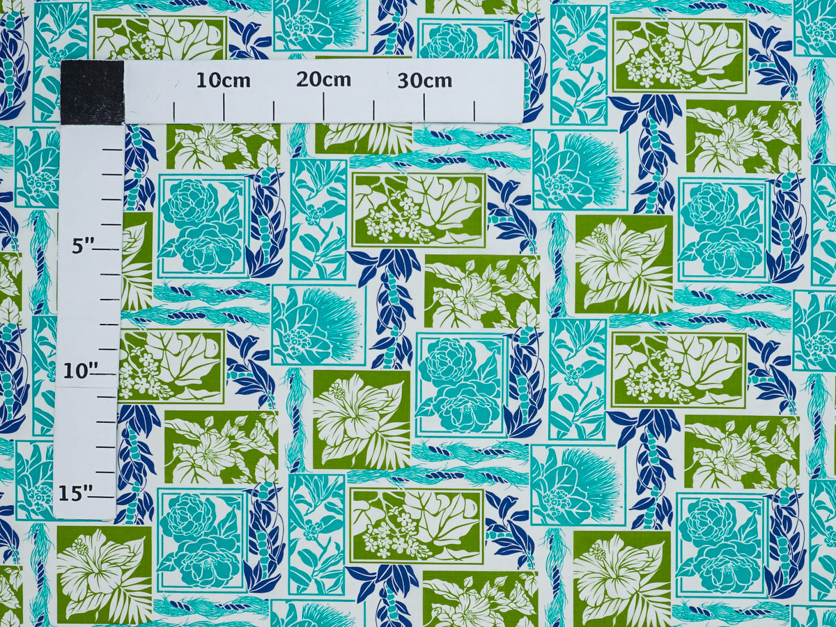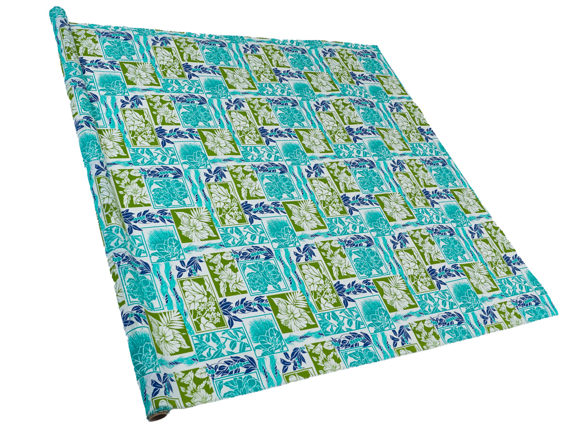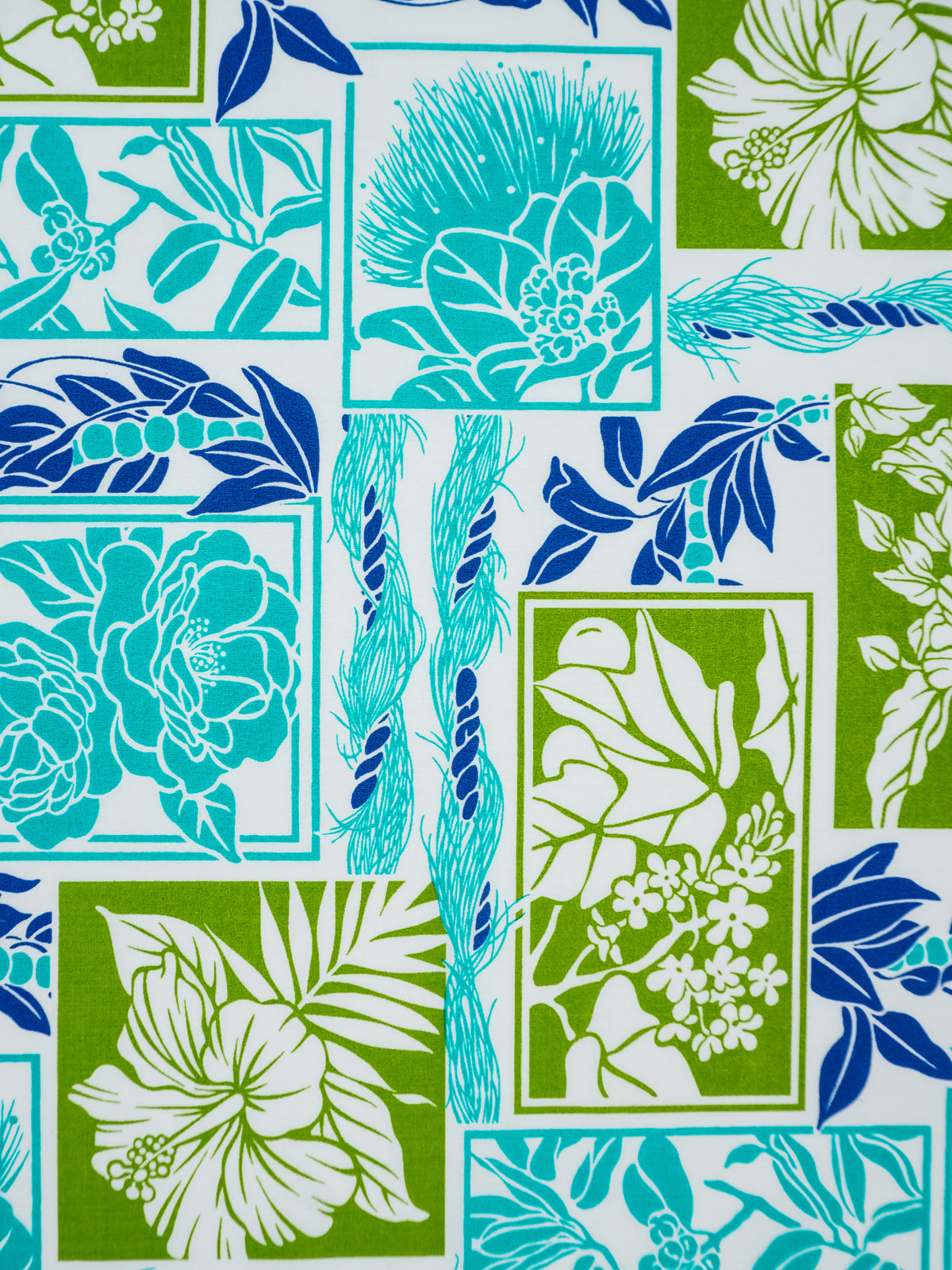 Ka Makani - Gardenia, Hibiscus & Ohia Lehua Blue & Natural Poly Cotton Hula Pau Skirt / 3 Bands