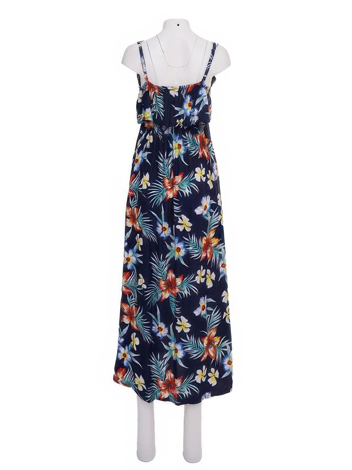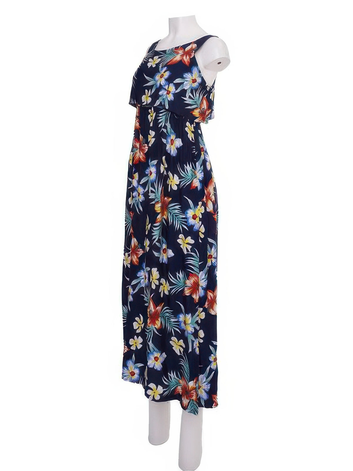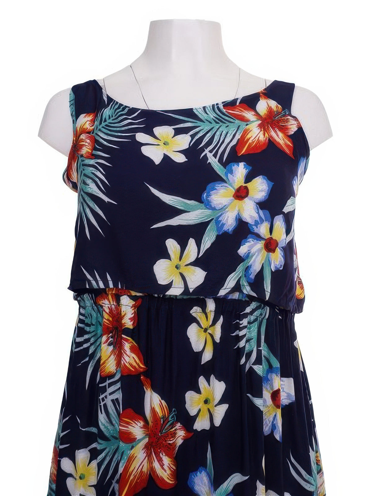 Napua Collection Honolulu - Plumeria Palm Navy Rayon Batik Ruffle MAXI Dress