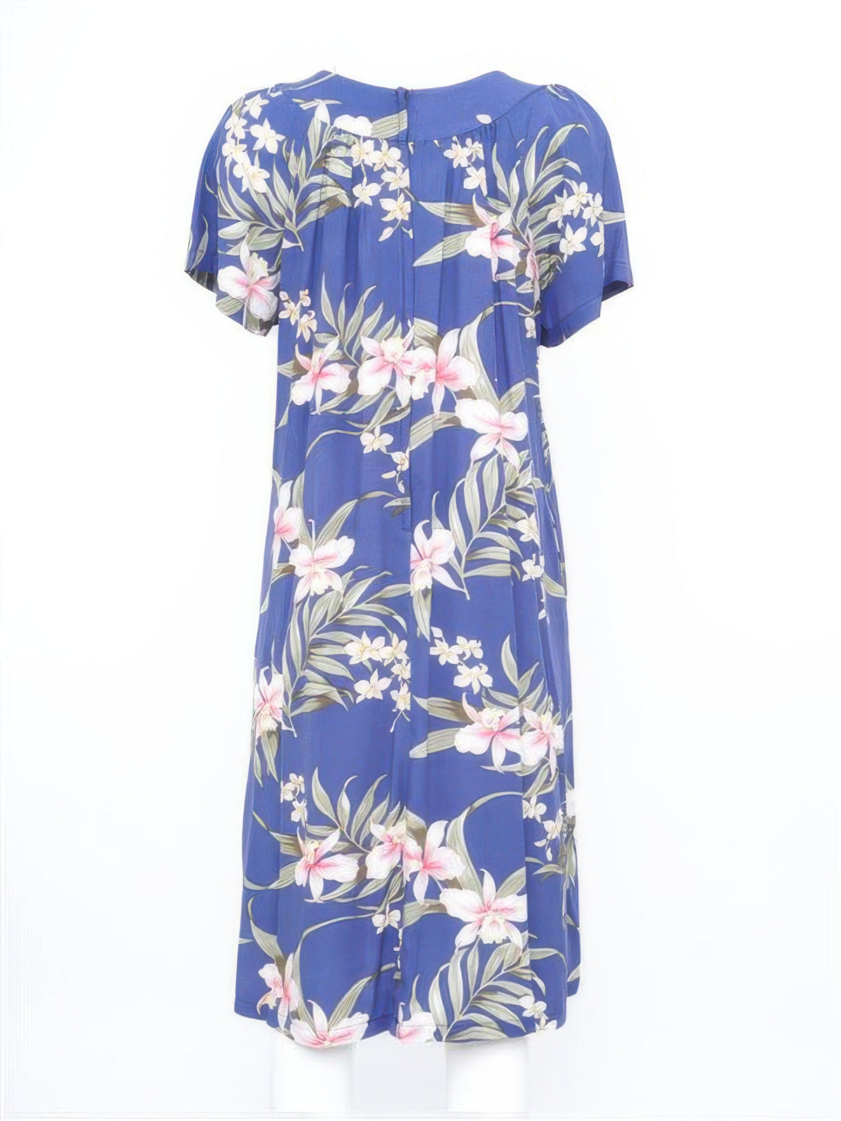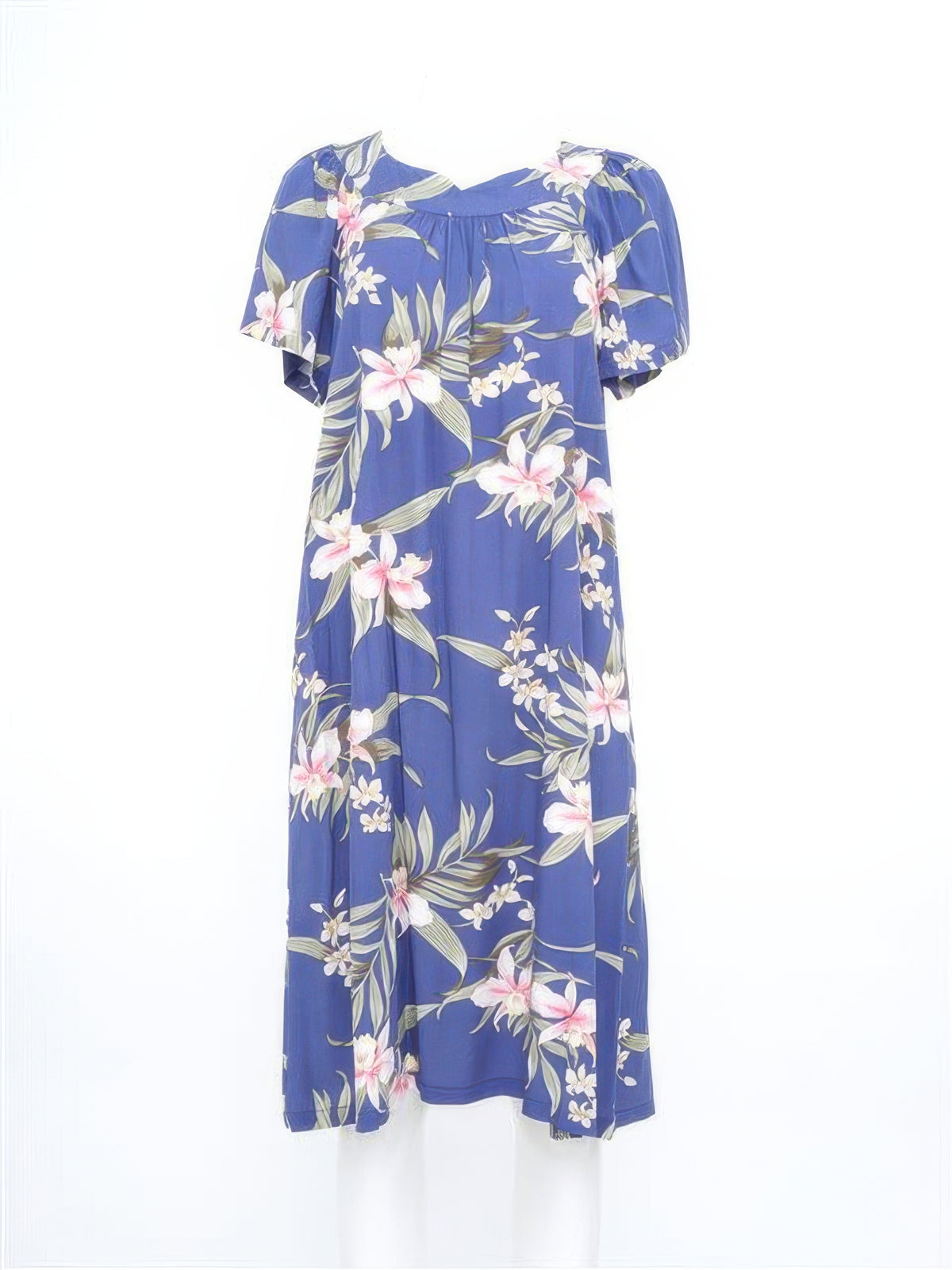 Two Palms - Pali Orchid Blue Rayon Hawaiian Midi Muumuu Dress