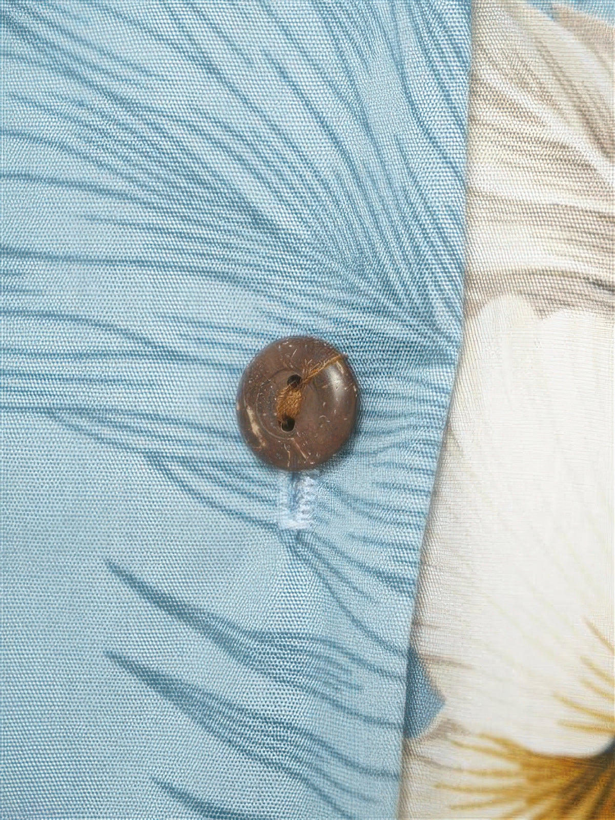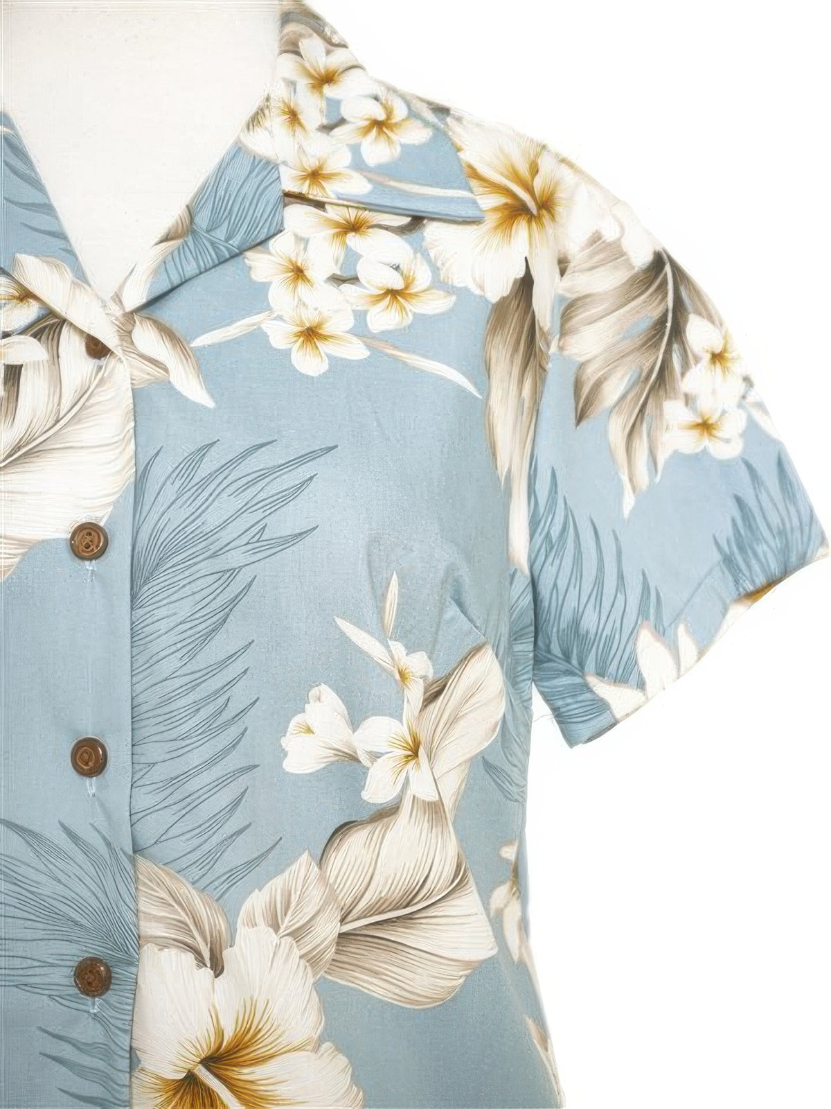 Bring the aloha spirit to your wardrobe with this Women’s Hawaiian Shirt by Pacific Legend. Featuring a delicate hibiscus and leaf floral design on a soft light blue background, this fitted shirt blends tropical elegance with everyday comfort.