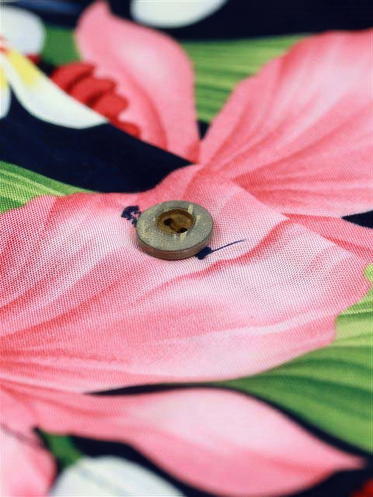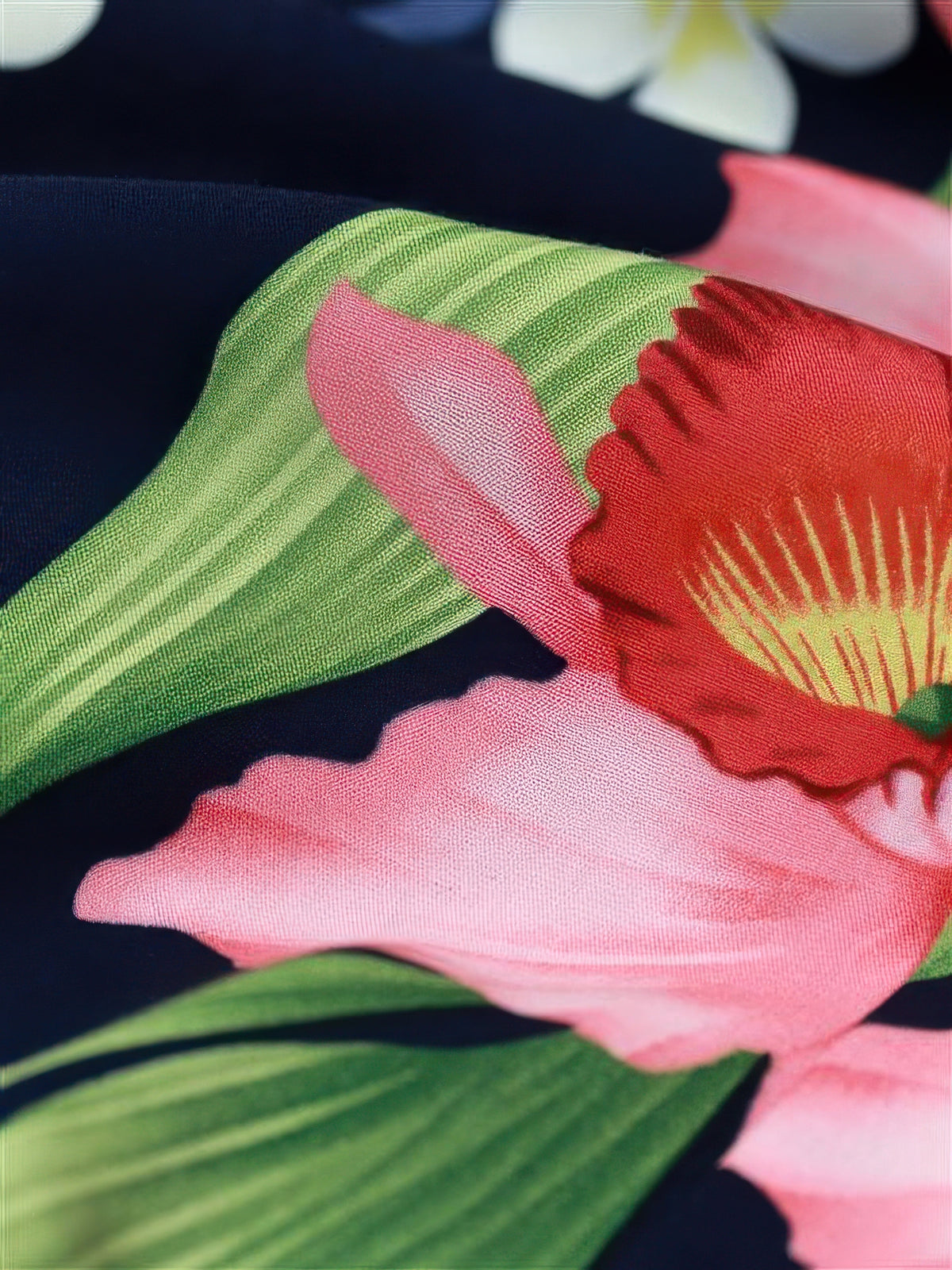Bring the spirit of the islands to your wardrobe with this Women’s Hawaiian Shirt by Two Palms. Made in Hawaii from 100% soft, breathable rayon, it features a relaxed open collar design and a beautiful floral print of orchids and plumeria on a classic navy background. Perfectly lightweight and comfortable, this shirt is your go-to piece for both casual days and tropical getaways.