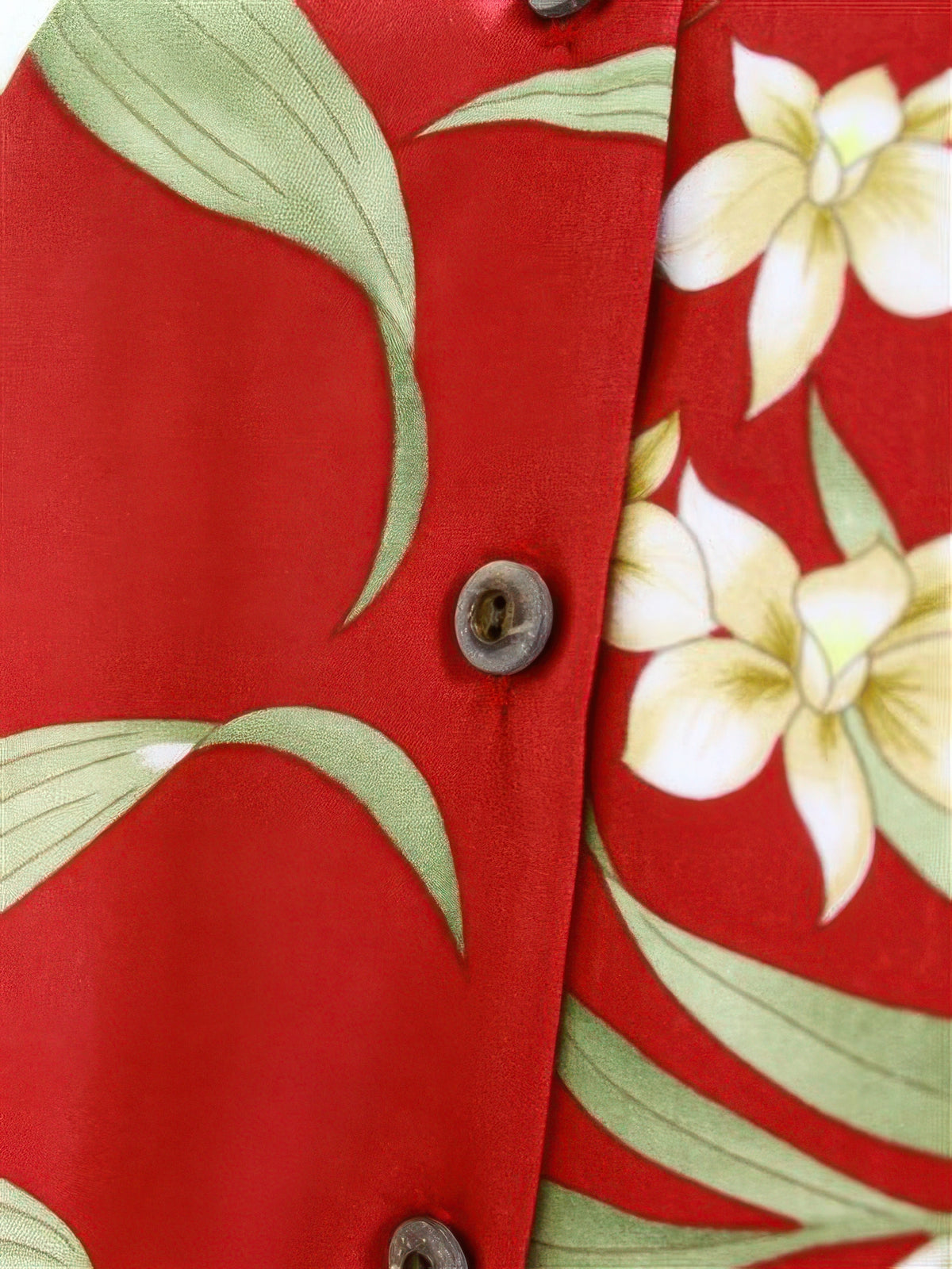 Add a bold touch of island beauty with this Women’s Hawaiian Shirt featuring a vibrant red orchid floral design. Made in Hawaii by Two Palms, this shirt blends tropical elegance with everyday comfort.
