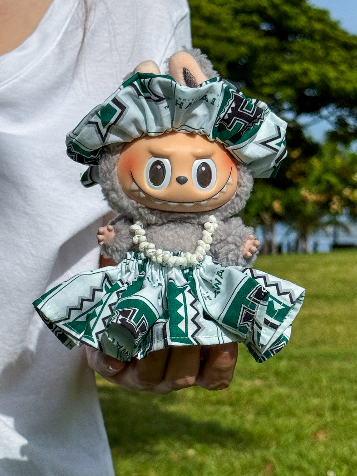 We crafted our genuine Pa'u Skirts in a fun, smaller size just for your Labubu! Designed with Pop Mart Labubu in mind, the stretchy waistband fits other similar-sized figures too. We added real mongo shells to make a tiny lei, finishing this adorable set. Made and shipped straight from Hawaii, it brings a splash of ALOHA to your Labubus. Featuring officially licensed University of Hawaii fabric with the Big H logo, it’s a perfect island-inspired outfit for your mini friends!