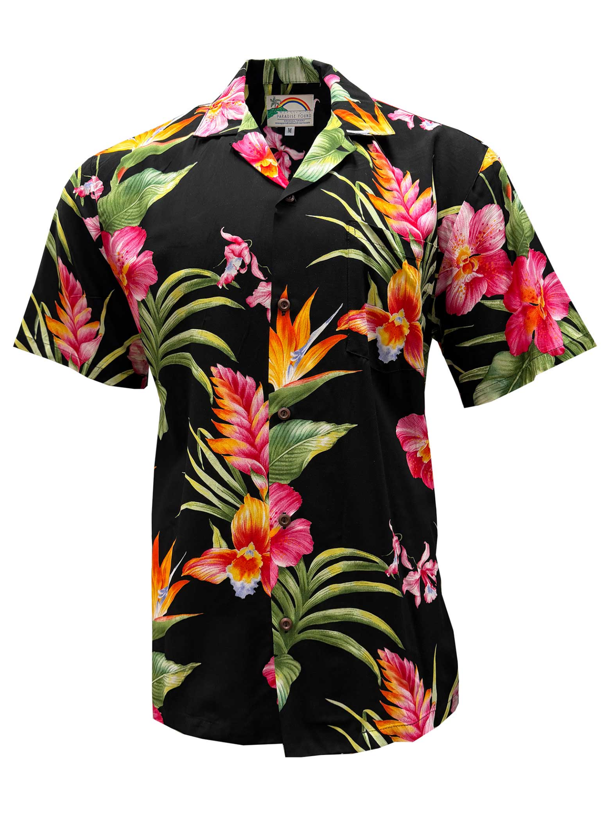 Embrace island life with the Blooms in Paradise aloha shirt in classic black. This vibrant design celebrates the tropical beauty of Hawaii with stunning bird of paradise, orchid, and hibiscus florals that bring island color to life. Crafted in Hawaii from 100% rayon, it offers a soft, breathable feel perfect for warm weather. The matched pocket with wood buttons adds authentic island charm.
