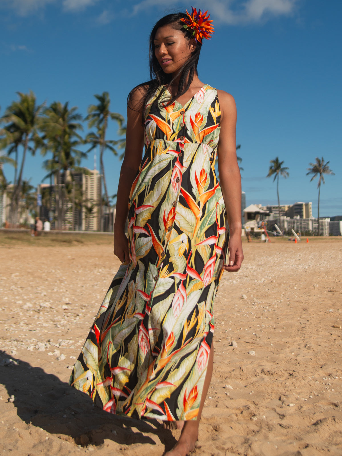 This dress has tank-top sleeves with a V-neck and a button-down front. The front buttons are made from real coconut husks and the waist includes an adjustable tie in the back. Two bottom side slits allow you to move freely while you wear the dress. It also includes two hidden side seam pockets for carrying small items.