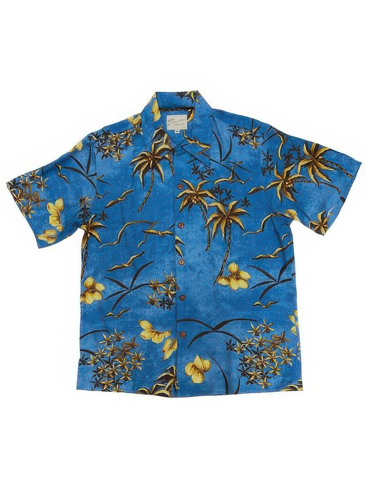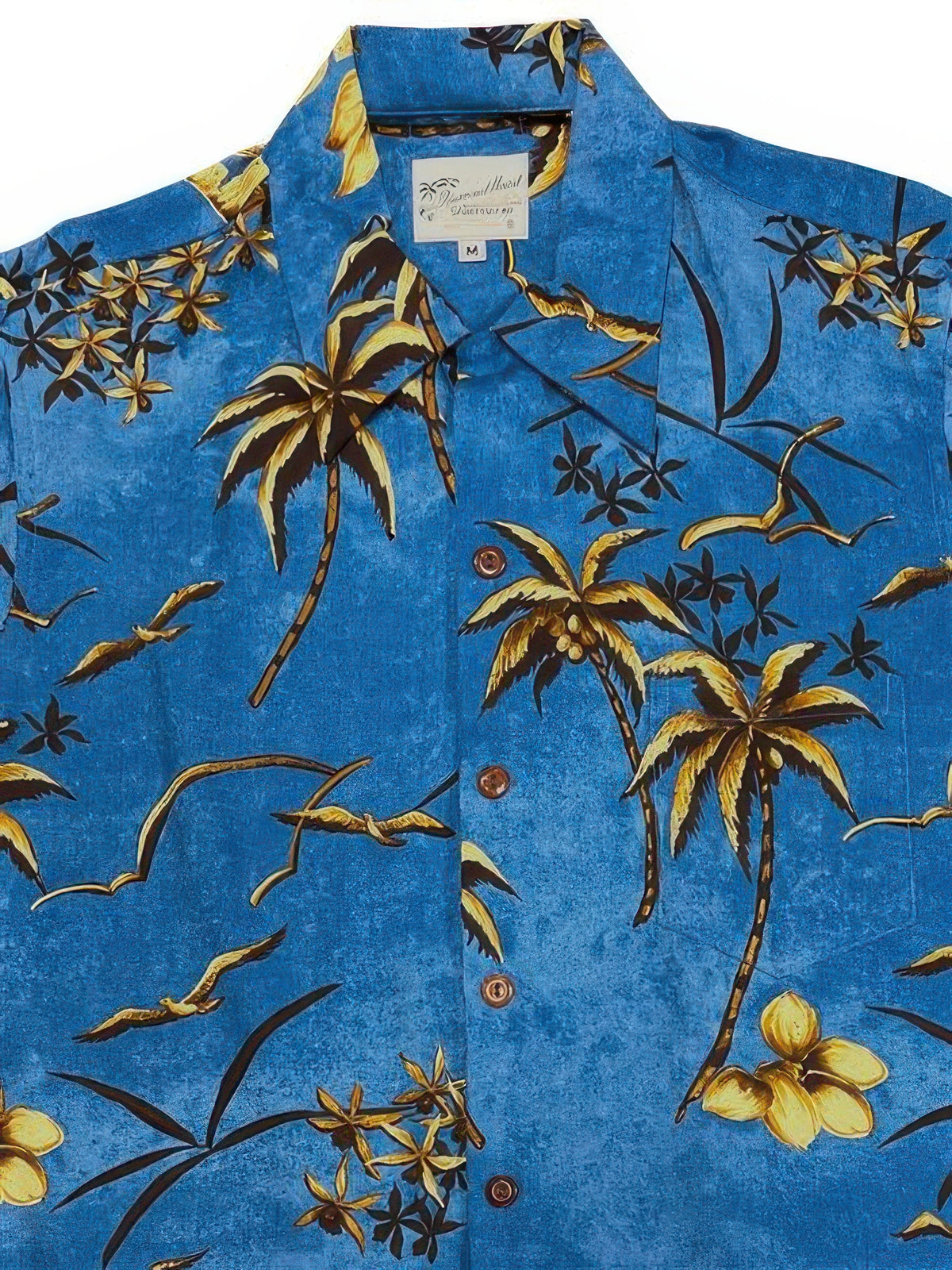 Welcome to paradise! This retro-inspired Vintage Oasis blue shirt by Diamond Head Sportswear shirt gives you a tropical escape with its vibrant palm trees and silhouettes of soaring night birds done in warm vintage-style artwork. Uniquely crafted for an old-Hawaii-inspired feel, this handsome shirt is sure to put you in an aloha state of mind. This enchanting Aloha shirt is made of 100% rayon and has a matched pocket and real coconut buttons.
