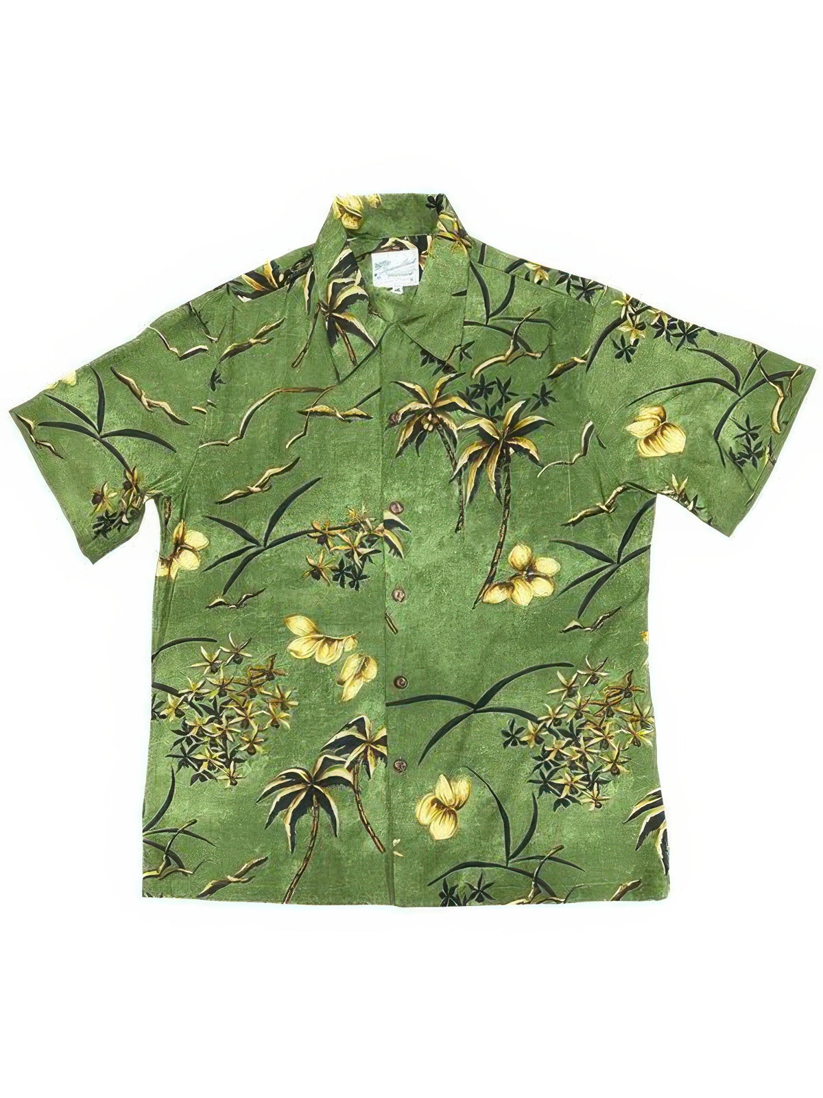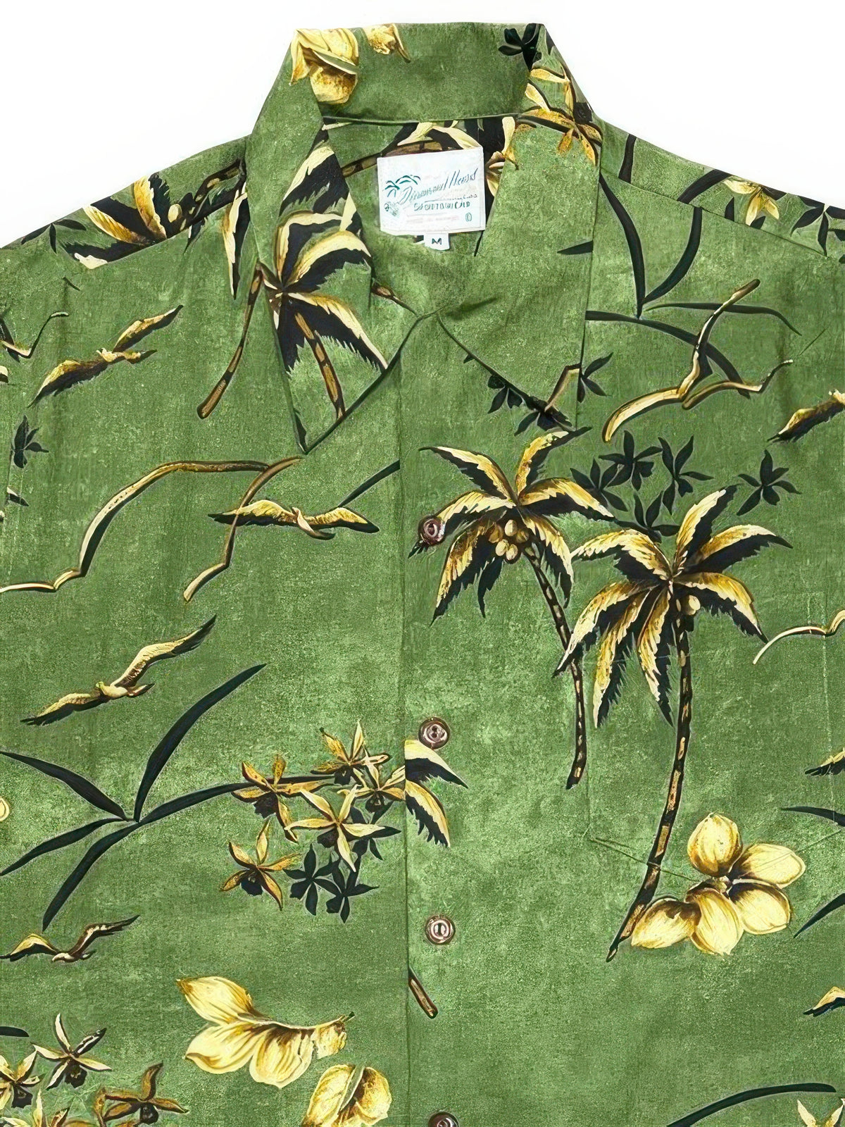 Welcome to paradise! This retro-inspired Vintage Oasis green shirt by Diamond Head Sportswear shirt gives you a tropical escape with its vibrant palm trees and silhouettes of soaring night birds done in warm vintage-style artwork. Uniquely crafted for an old-Hawaii-inspired feel, this handsome shirt is sure to put you in an aloha state of mind. This enchanting Aloha shirt is made of 100% rayon and has a matched pocket and real coconut buttons.